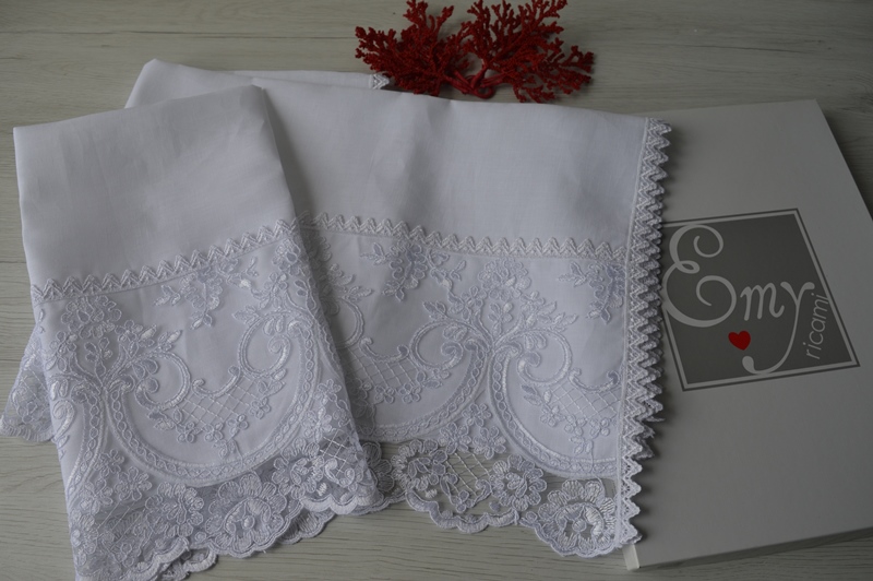 ASCIUGAMANI DI PURO LINO CON PIZZO REBRODE' ART. BIANCANEVE