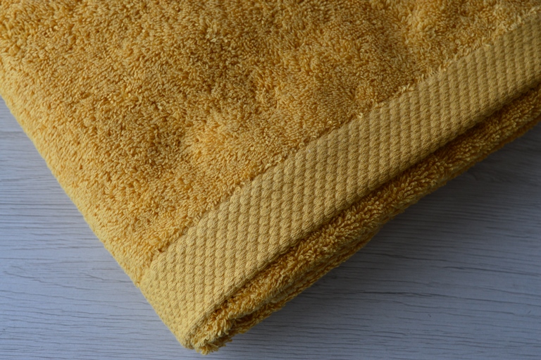 coppia asciugamano grande e piccola colore oro composizione 100% cotone misura piccola cm 57x38 grande cm 103x56 peso 500gr al mtq rifinita in basso con greca da 3cm