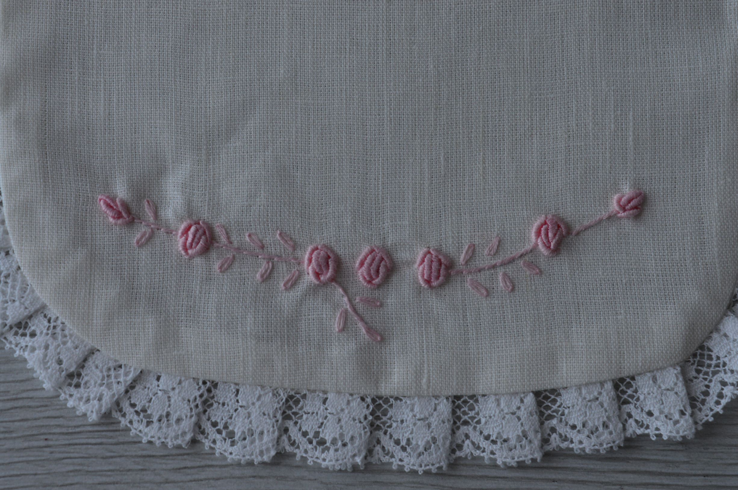 BAVETTA ARTIGIANALE RICAMATA A MANO COMPOSIZIONE 100% PURO LINO ITALIANO RIFINITA CON PIZZO VALENCIENNES E RICAMATA A MANO COLORE AVORIO E RICAMO IN ROSA MISURA CM 18X18 SU RICHIESTA SI PUO ANCHE PERSONALIZZARE