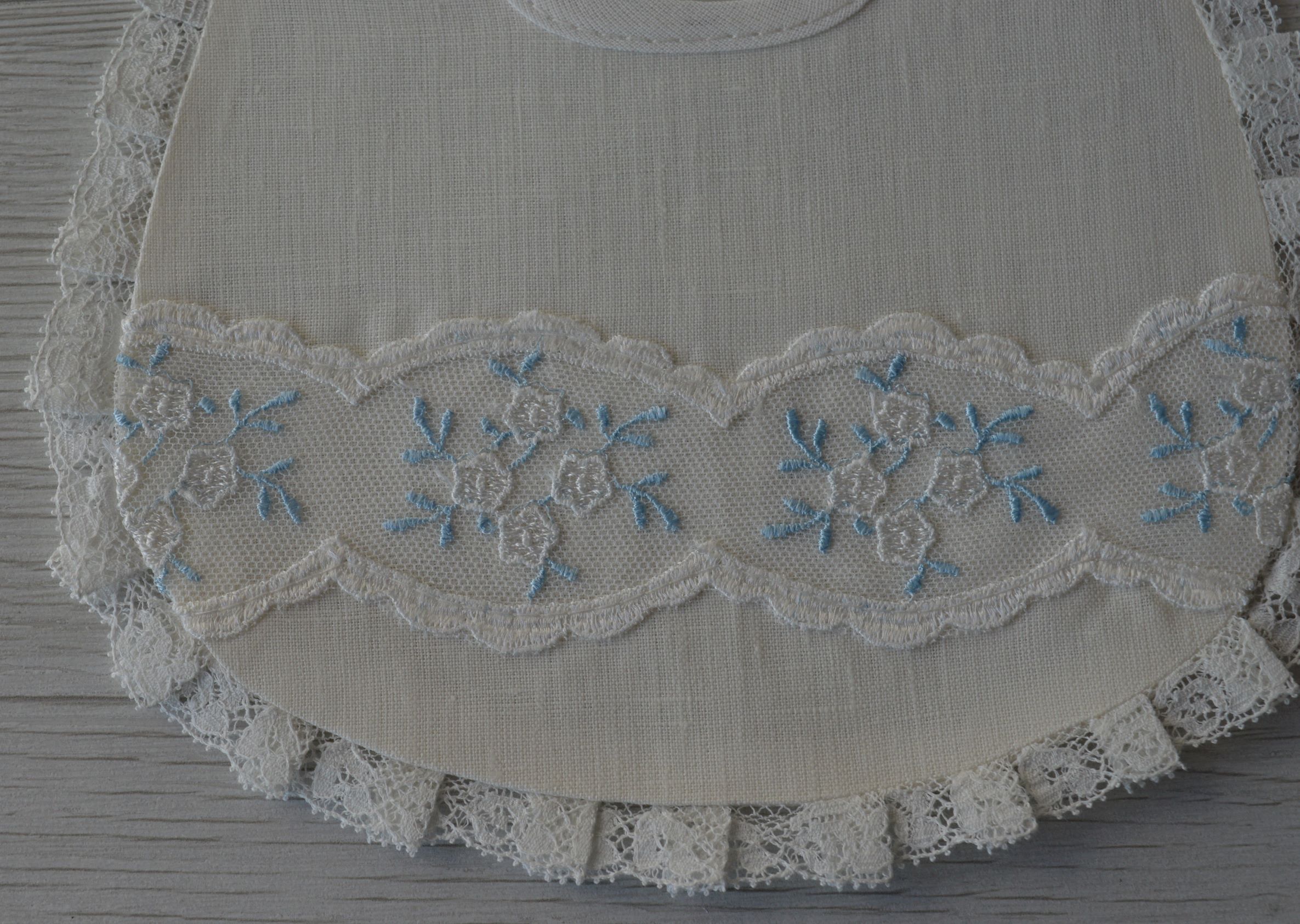 Bavetta artigianale di Emy ricami composizione 100% puro lino Italiano rifinita con pizzo valenciennes e tulle bicolore misura cm 19x19 colore avorio e celeste consigliabile lavaggio a mano in acqua a temperatura ambiente su richiesta possibilita di personalizzare la bavetta contattando i nostri info.