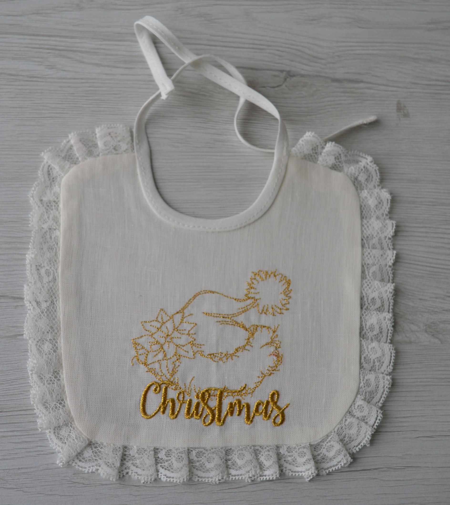 Bavetta artigianale natalizia composizione 100% puro lino Italiano rifinita con un pregiatissimo pizzo ricamo a macchina misura cm 18x18 colore avorio con ricami oro