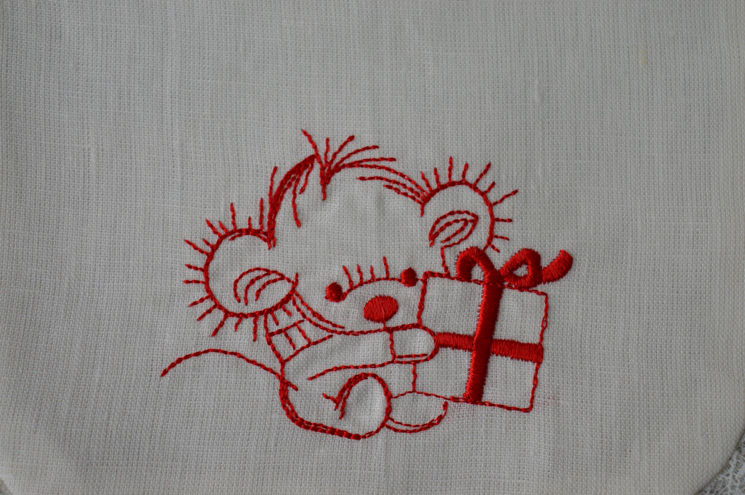 Bavetta artigianale natalizia composizione 100% puro lino Italiano rifinita con un pregiatissimo pizzo valenciennes ricamo a macchina misura cm 18x18 colore avorio con ricami in rosso