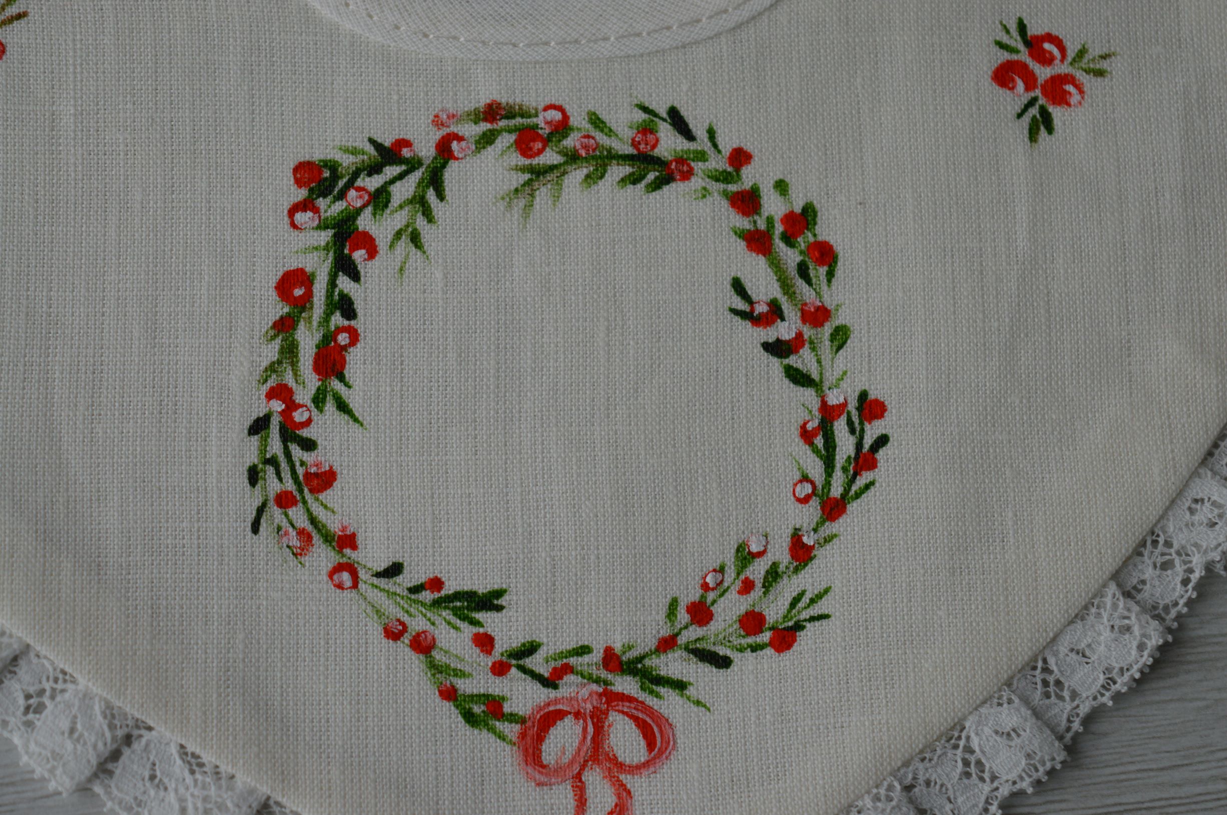Bavetta artigianale natalizia composizione 100% puro lino Italiano rifinita con un pregiatissimo pizzo valenciennes dipinta a mano misura cm 20x20 colore avorio con disegni natalizi su richiesta si puo anche persolazzire contattando i nostri info.