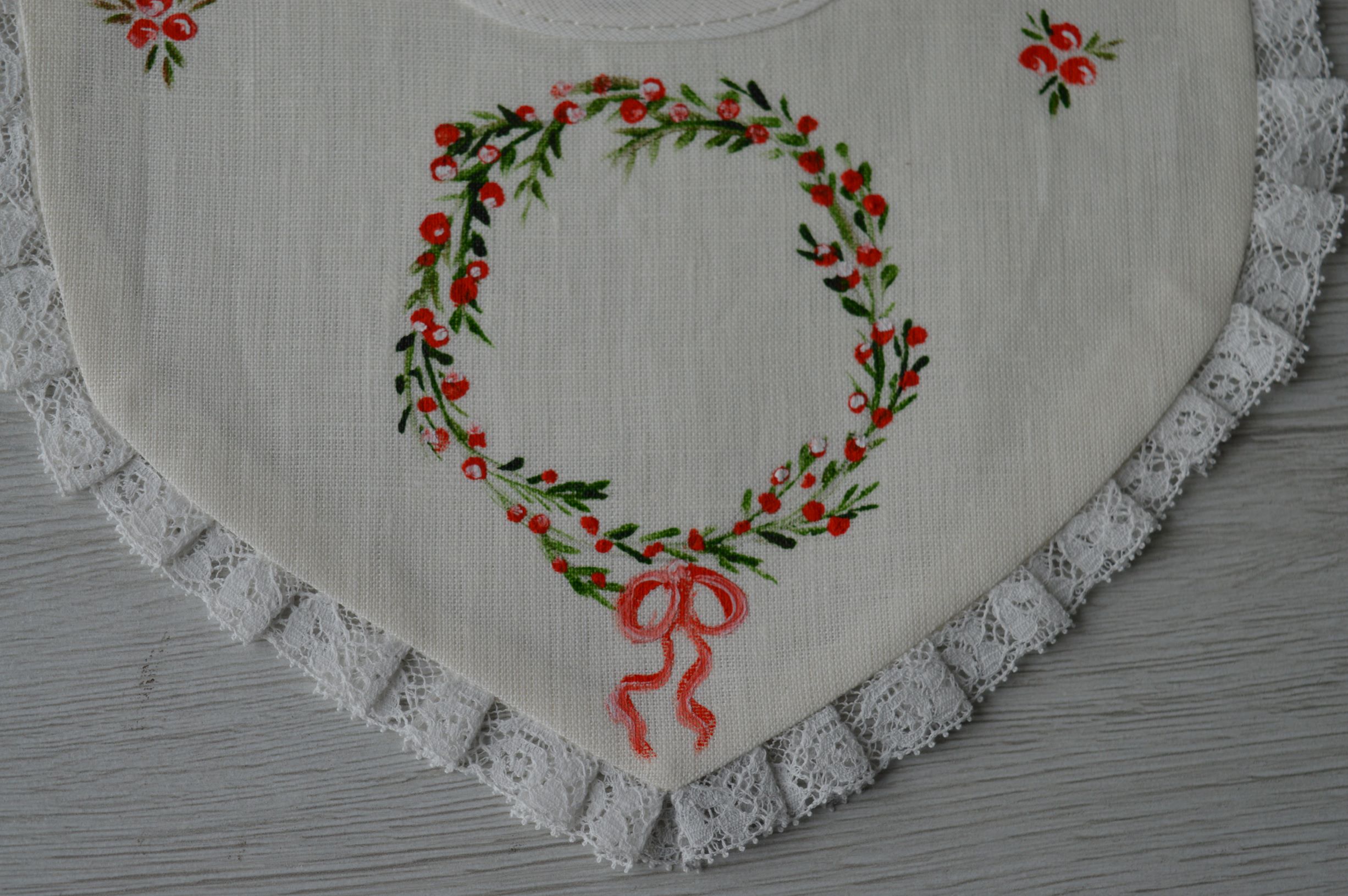 Bavetta artigianale natalizia composizione 100% puro lino Italiano rifinita con un pregiatissimo pizzo valenciennes dipinta a mano misura cm 20x20 colore avorio con disegni natalizi su richiesta si puo anche persolazzire contattando i nostri info.