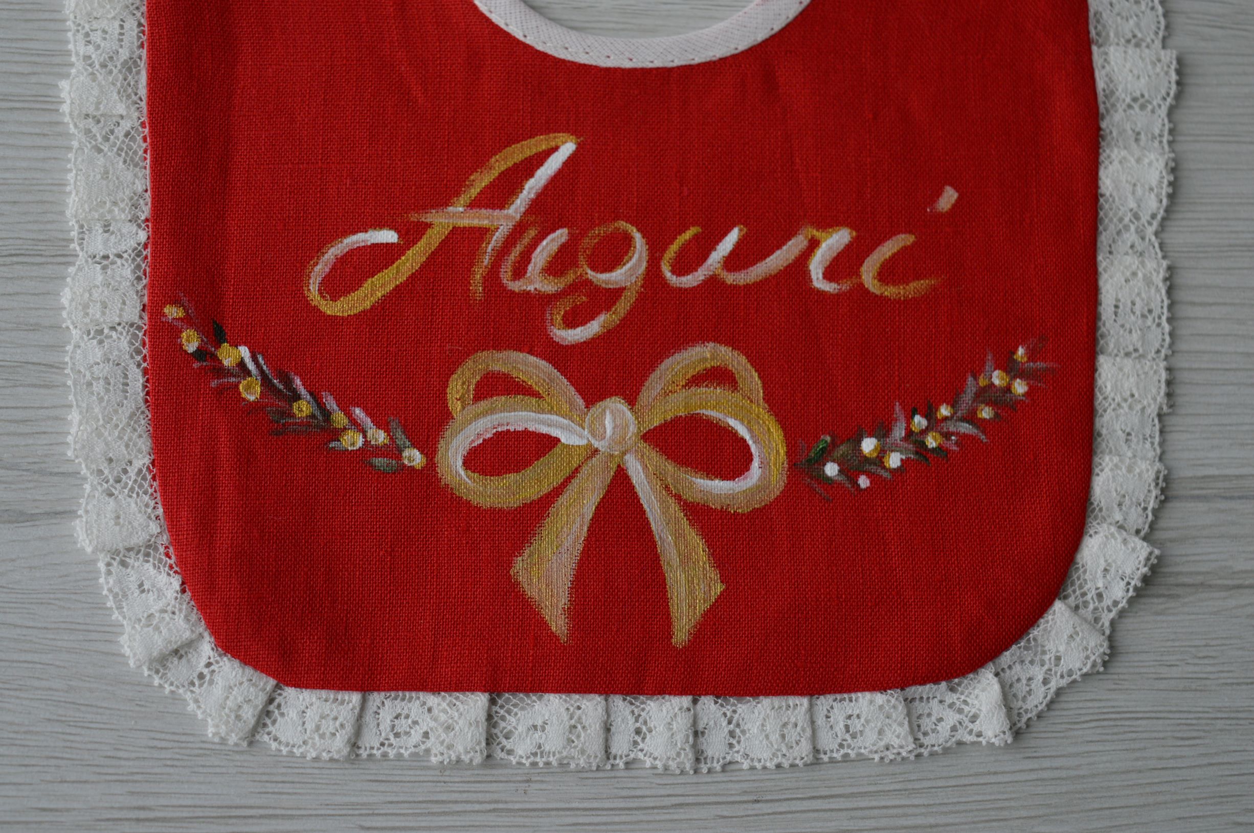 Bavetta artigianale natalizia composizione 100% puro lino Italiano rifinita con un pregiatissimo pizzo valenciennes dipinta a mano misura cm 18x18 colore rosso con disegni natalizi