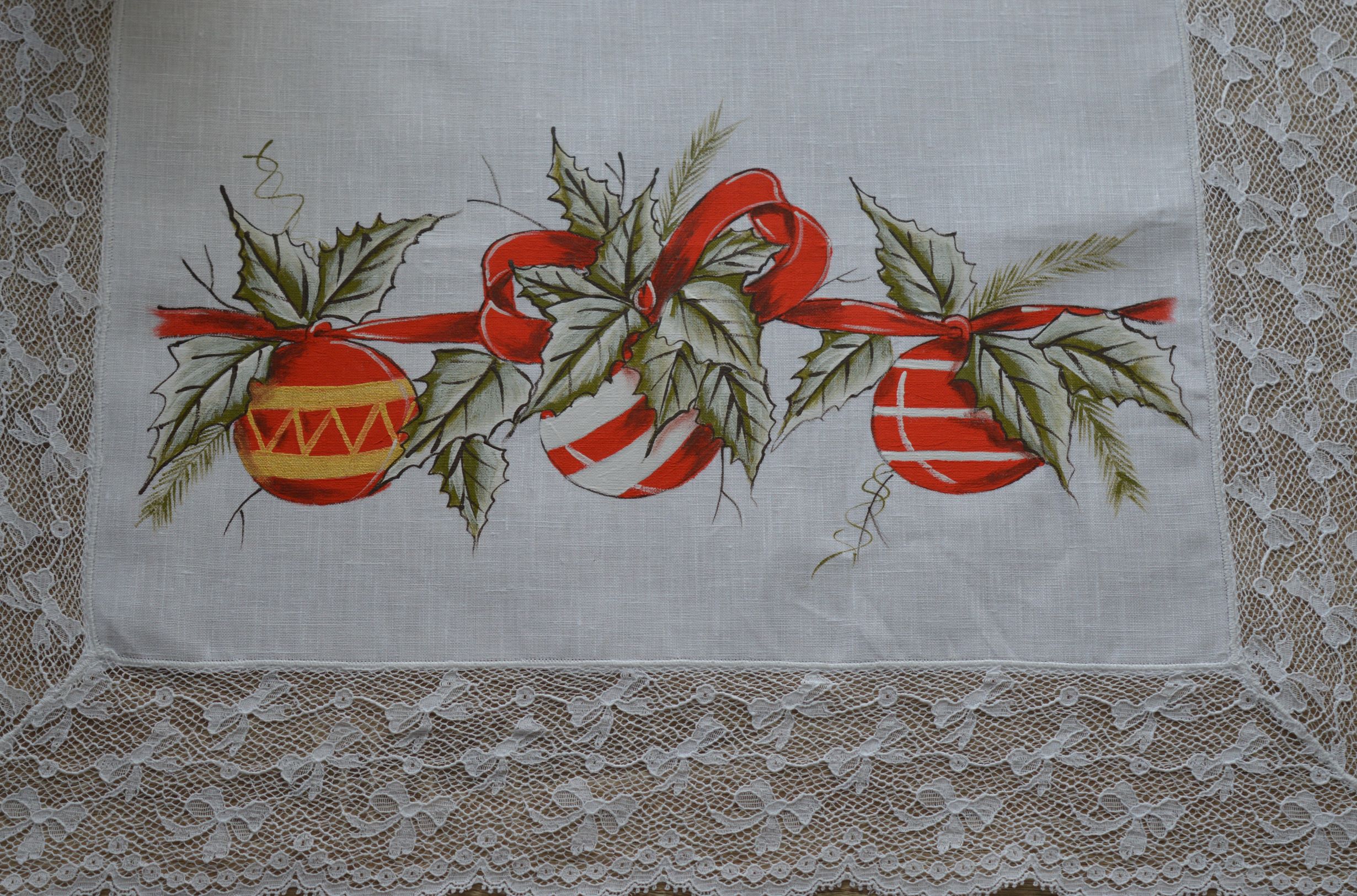 centro tavola natalizio artigianale di Emy ricami comp 100% puro lino italiano di colore bianco rifinito con un pregiatissimo pizzo valenciennes e dipinto a mano mis cm 50x85 su richiesta è possibile personalizzare il centro contattando i nostri info.