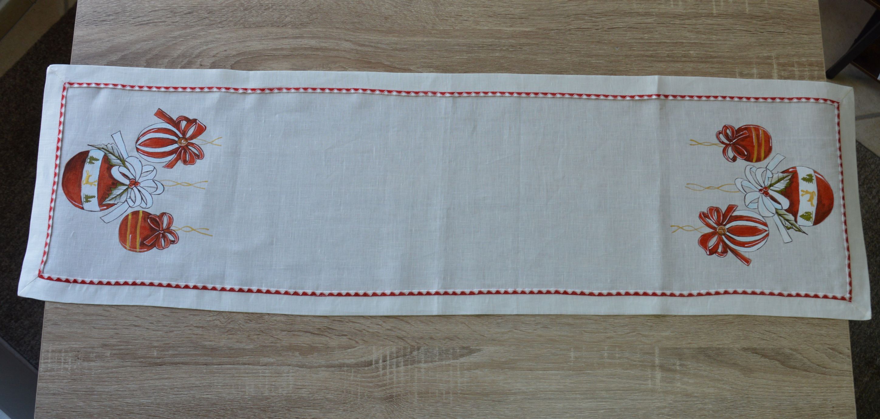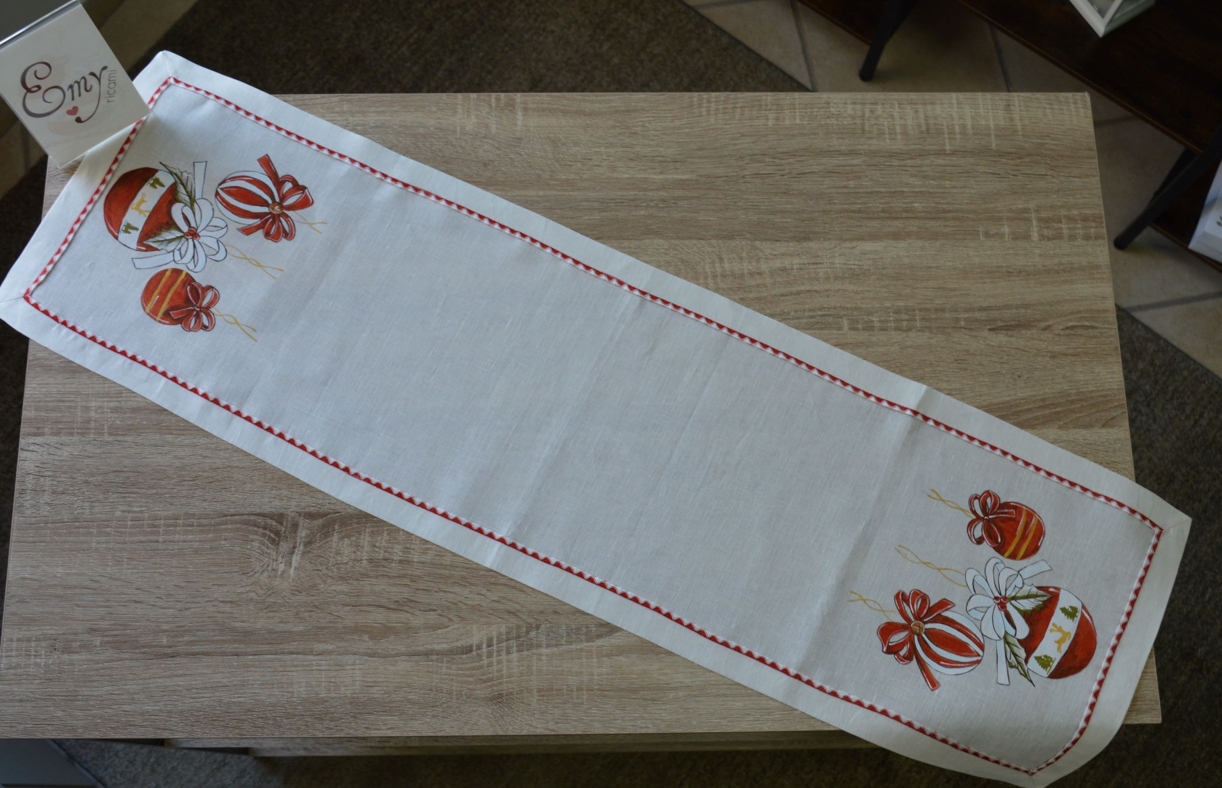 Centrotavola natalizio artigianale in puro lino dipinto a mano da Emy ricami mis cm 42x130 art palle