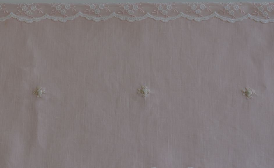 RICAMATO A MANO CON PUNTI VAPORE ROSA E AVORIO.
