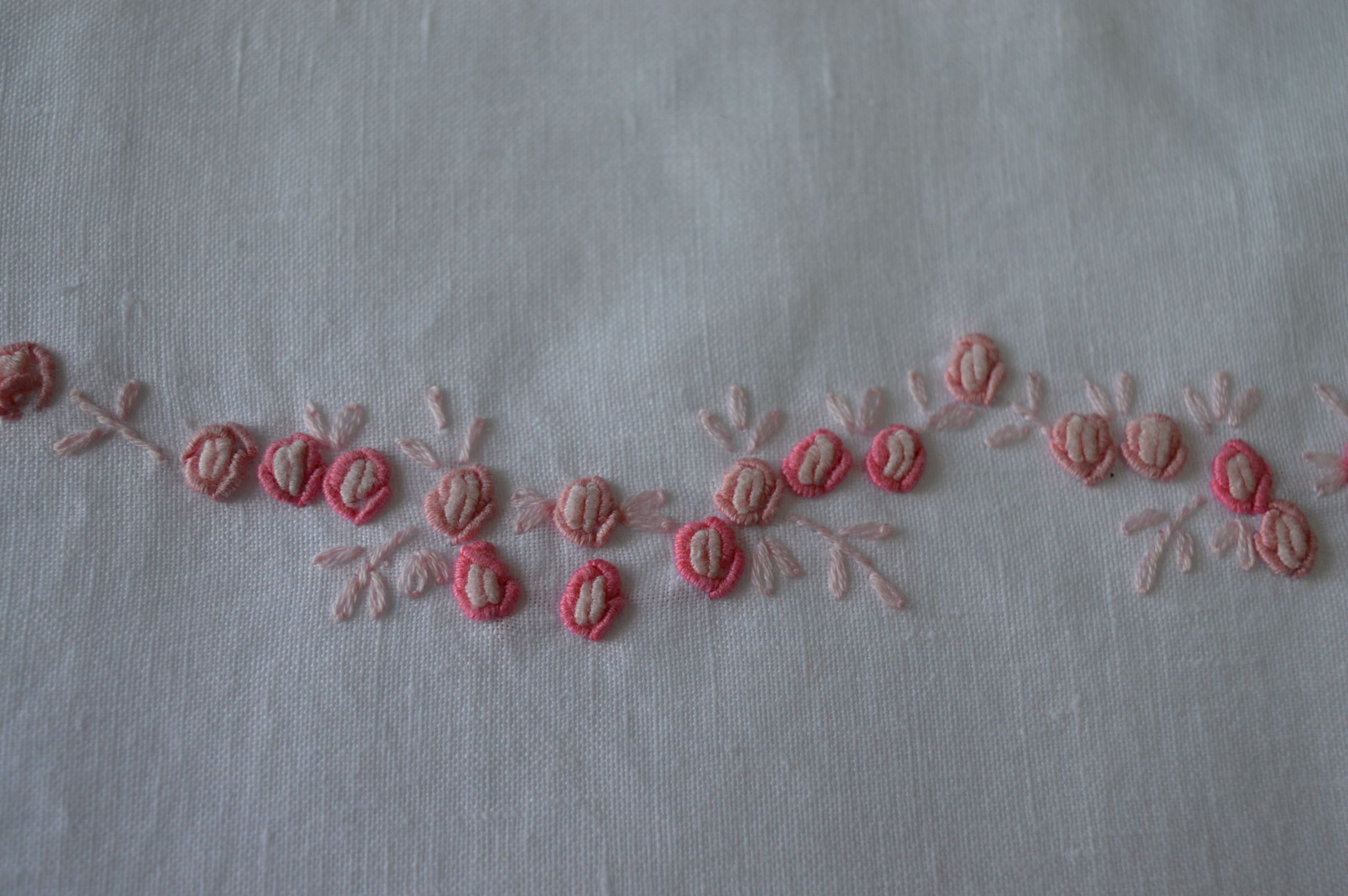 completo carrozzina artigianale di Emy ricami copertina imbottita sfoderabile mis cm 60x80 interno copertina fiocco anallergico 100% poliestere rivestito in cotone percalle lenzuolo sopra mis cm 65x110 federa mis cm 27x40 colore bianco con ricami rosa chiaro e scuro composizione puro lino italiano 100% ricami punto vapore eseguiti a mano rifinitura punto a giorno eseguito a mano su richiesta è possibile personalizzare il prodotto contattando i nostri info.