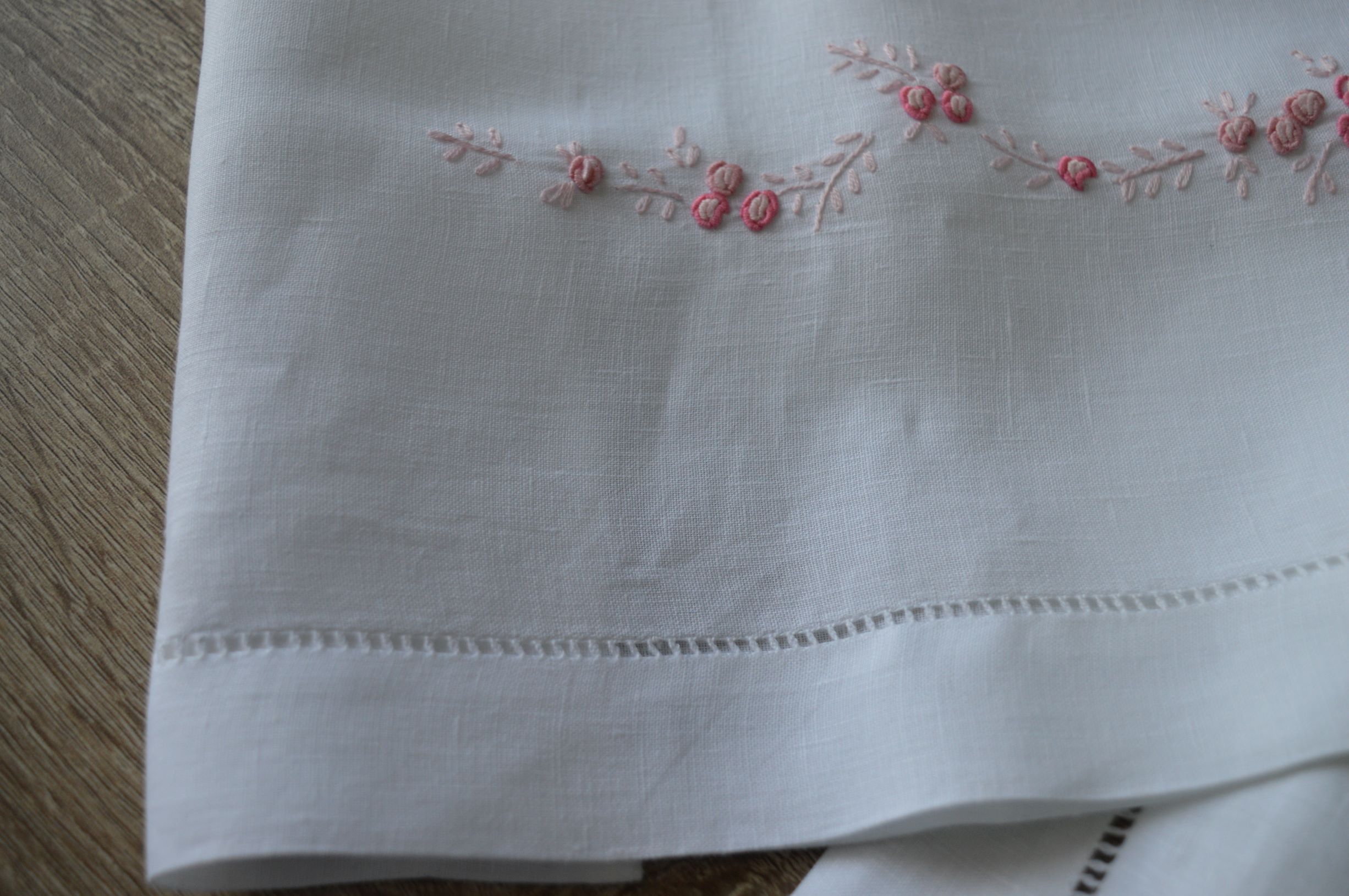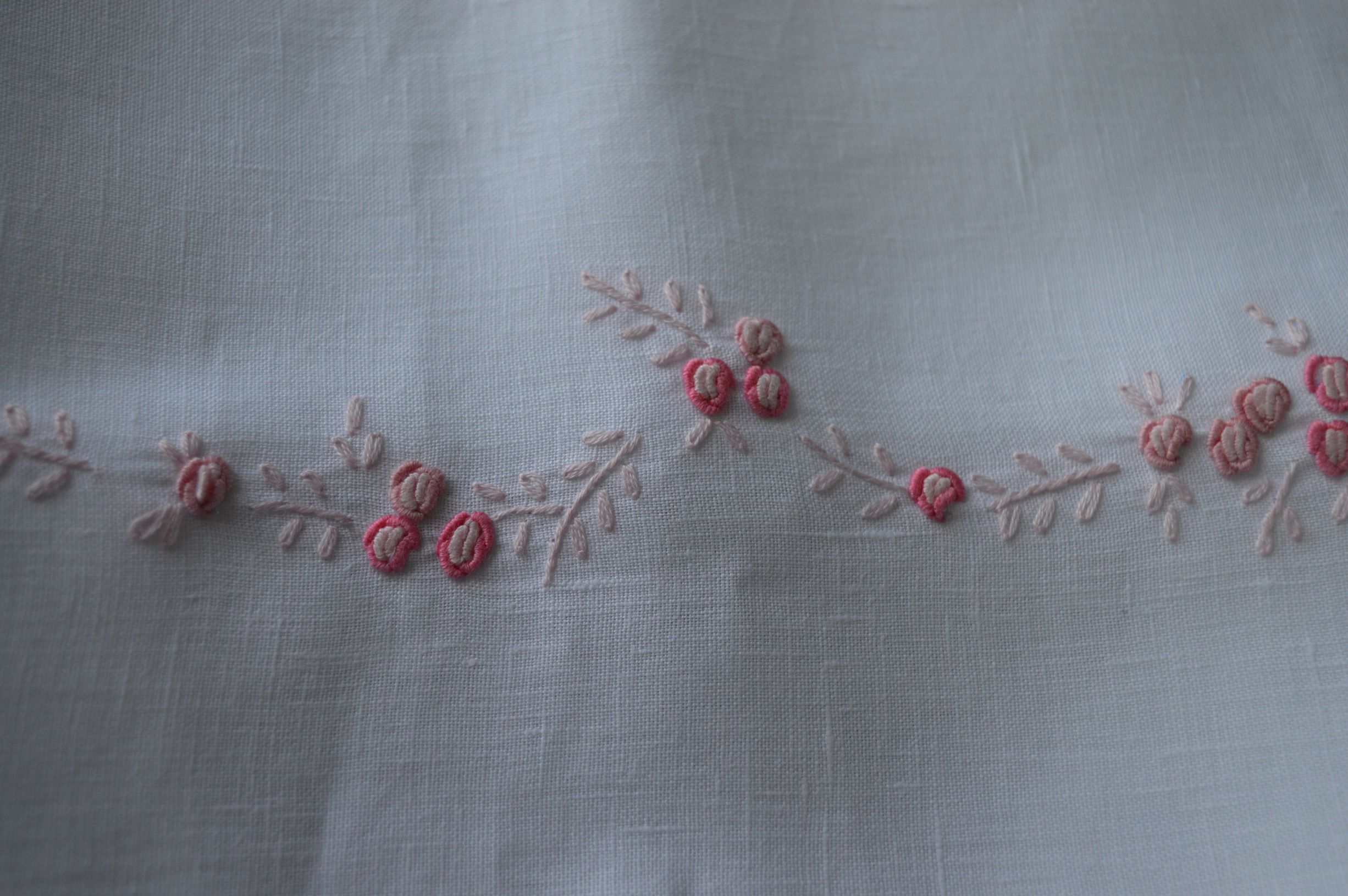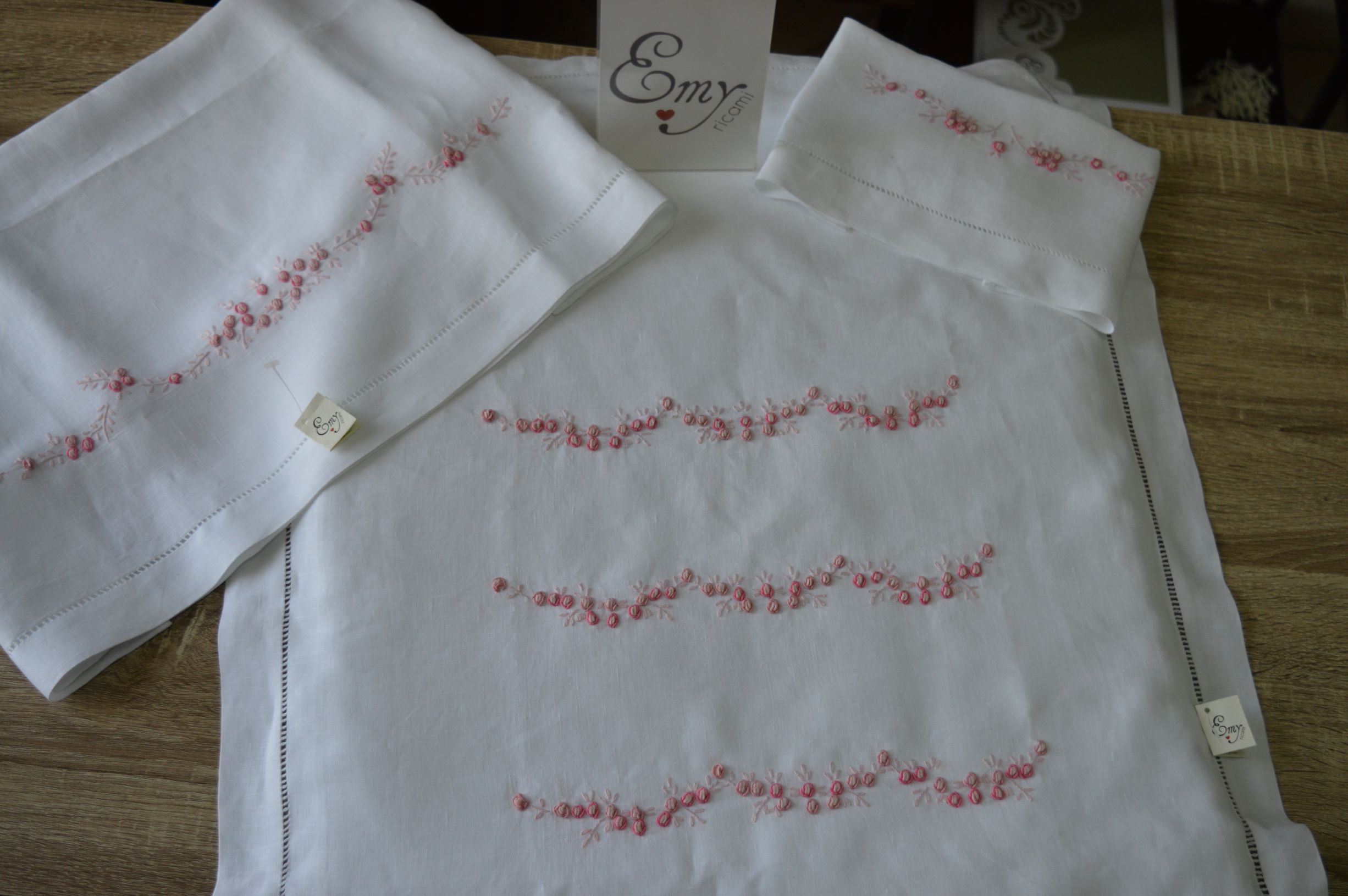 completo carrozzina artigianale di Emy ricami copertina imbottita sfoderabile mis cm 60x80 interno copertina fiocco anallergico 100% poliestere rivestito in cotone percalle lenzuolo sopra mis cm 65x110 federa mis cm 27x40 colore bianco con ricami rosa chiaro e scuro composizione puro lino italiano 100% ricami punto vapore eseguiti a mano rifinitura punto a giorno eseguito a mano su richiesta è possibile personalizzare il prodotto contattando i nostri info.