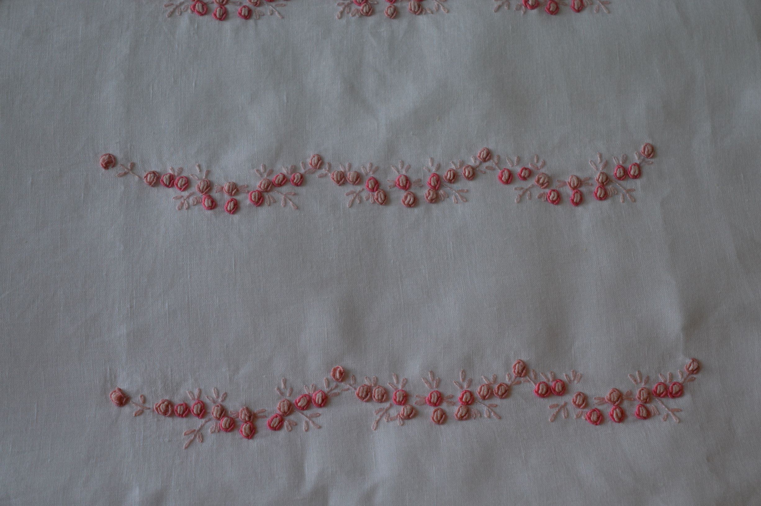 completo carrozzina artigianale di Emy ricami copertina imbottita sfoderabile mis cm 60x80 interno copertina fiocco anallergico 100% poliestere rivestito in cotone percalle lenzuolo sopra mis cm 65x110 federa mis cm 27x40 colore bianco con ricami rosa chiaro e scuro composizione puro lino italiano 100% ricami punto vapore eseguiti a mano rifinitura punto a giorno eseguito a mano su richiesta è possibile personalizzare il prodotto contattando i nostri info.