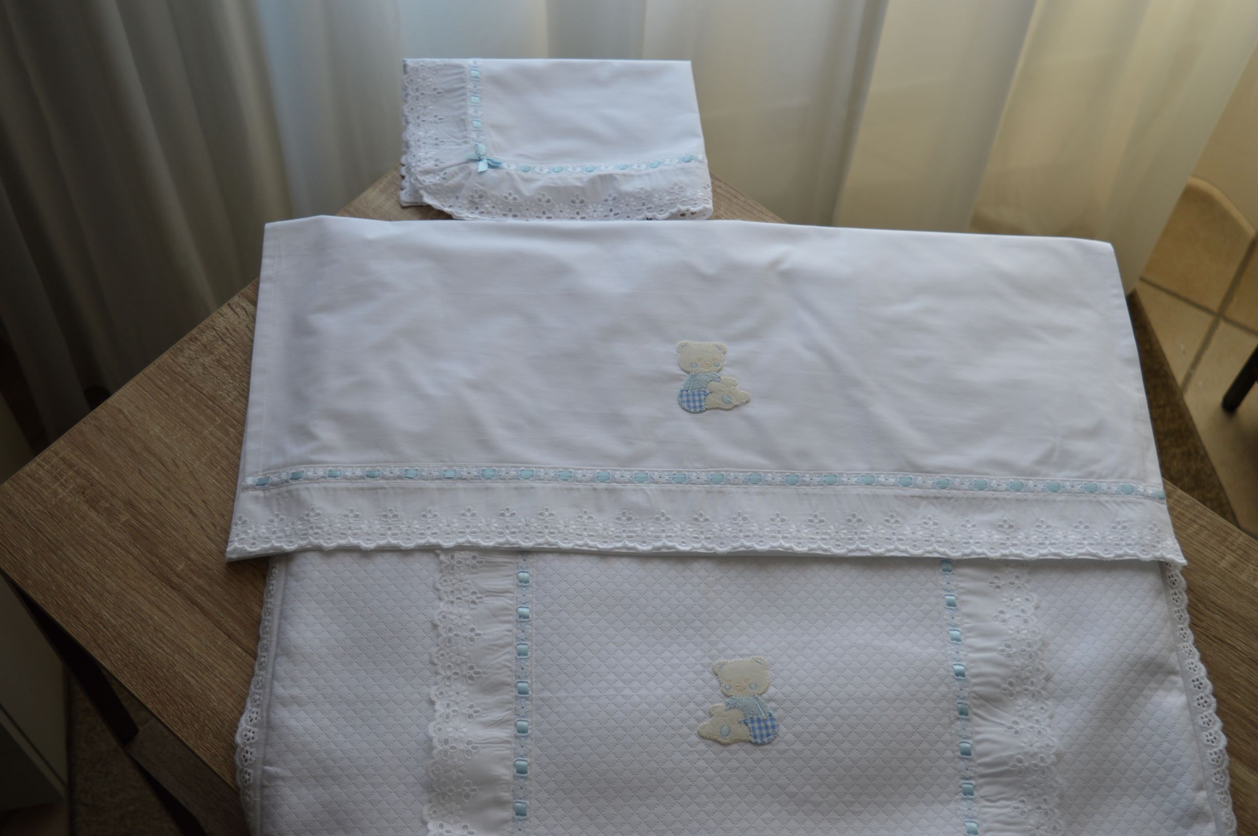 COMPETO CARROZZINA RIFINITO CON PIZZO SAN GALLO CREAZIONI DI EMY RICAMI COLORE BIANCO E CELESTE COPRILETTO TRAPUNTATO SFODERABILE MIS CM 64X80 LENZUOLO SOPRA MIS CM 66X116 FEDERA 33X48 COMPOSIZIONE COPRILETTO 100% COTONE PIQUET IMBOTTITURA 100% POLIESTERE ANALLERGICO LENZUOLINO E FEDERA 100% COTONE PERCALLE è POSSIBILE SU RICHIESTA PERSONALIZZARE IL COMPLETINO.