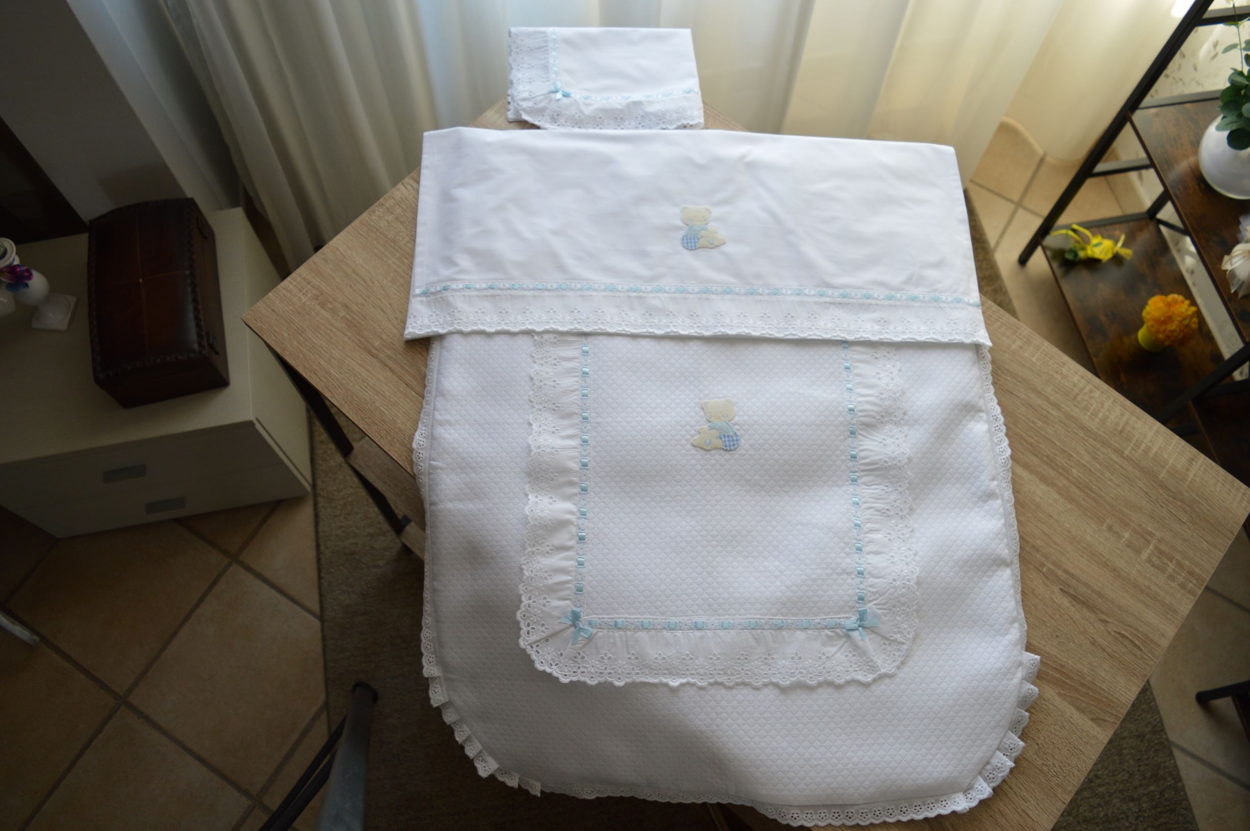 COMPETO CARROZZINA RIFINITO CON PIZZO SAN GALLO CREAZIONI DI EMY RICAMI COLORE BIANCO E CELESTE COPRILETTO TRAPUNTATO SFODERABILE MIS CM 64X80 LENZUOLO SOPRA MIS CM 66X116 FEDERA 33X48 COMPOSIZIONE COPRILETTO 100% COTONE PIQUET IMBOTTITURA 100% POLIESTERE ANALLERGICO LENZUOLINO E FEDERA 100% COTONE PERCALLE è POSSIBILE SU RICHIESTA PERSONALIZZARE IL COMPLETINO.