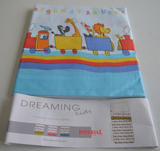 COMPLETO LENZUOLA SINGOLO FANTASIA FUNNY TRAIN COLORE CELESTE SOPRA 150X285 SOTTO 90X195 CON ANGOLI FEDERA 50X84 100% COTONE