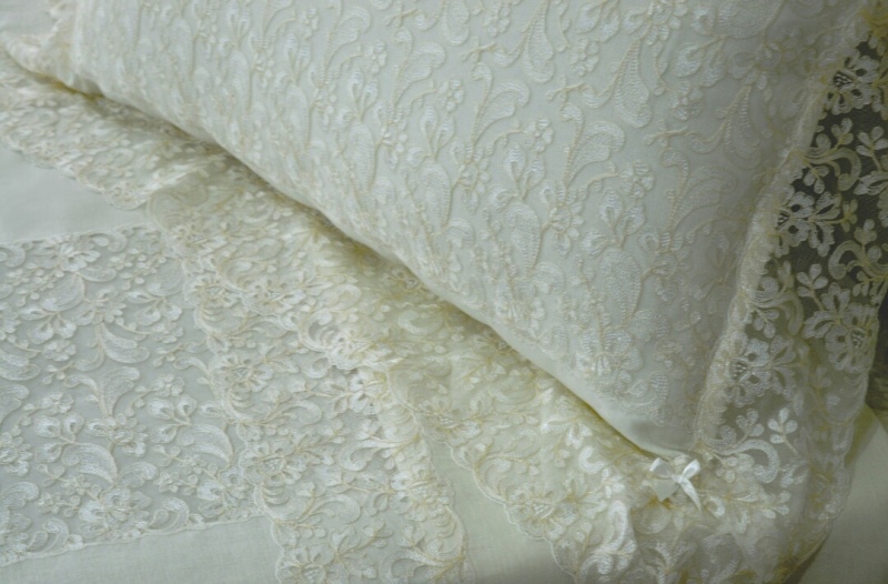 COMPOSIZIONE: PURO LINO BELLORA 306 COLORE AVORIO, RIFINITO CON PIZZO IN TULLE BICOLORE CON MEDAGLIONE CENTRALE RICAMATO IL TUTTO ESEGUITO INTERAMENTE A MANO.