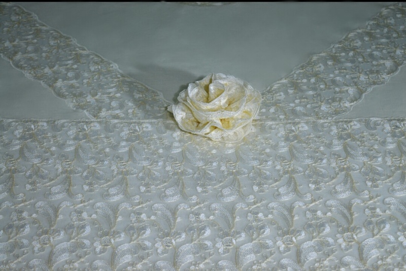 COMPOSIZIONE: PURO LINO BELLORA 306 COLORE AVORIO, RIFINITO CON PIZZO IN TULLE BICOLORE CON MEDAGLIONE CENTRALE RICAMATO IL TUTTO ESEGUITO INTERAMENTE A MANO.