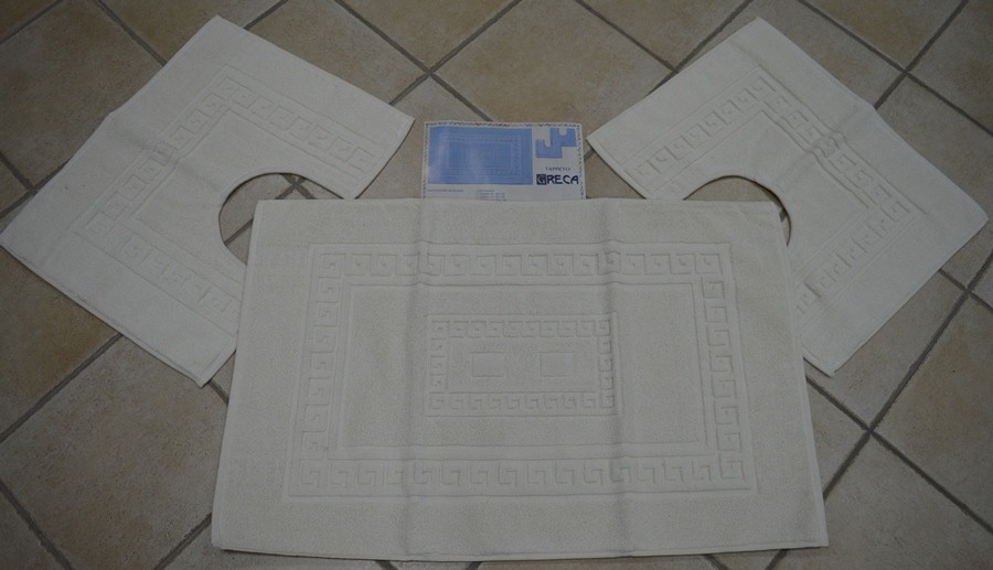 SET COMPLETO TAPPETI BAGNO TORINO DOUBLE FACE TRE PEZZI IL GRANDE MISURA 60X90 DUE PICCOLI MISURA 45X60 COMPOSIZIONE 80% COTONE 20% POLIESTERE PESO 1400 GR AL MQ COLORE PANNA PRODOTTO ADATTO ANCHE X ALBERGO MADE IN ITALY