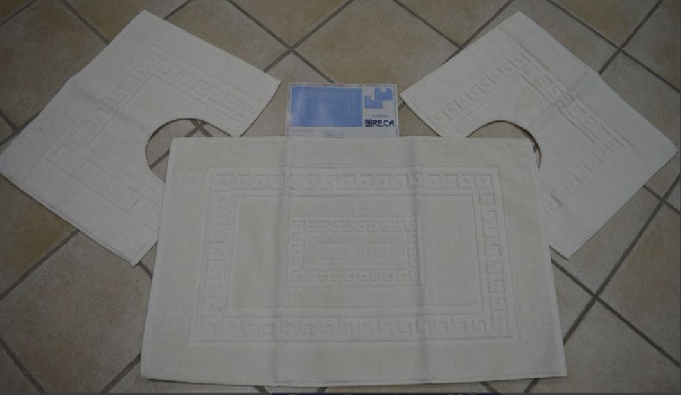 SET COMPLETO TAPPETI BAGNO TORINO DOUBLE FACE TRE PEZZI IL GRANDE MISURA 60X90 DUE PICCOLI MISURA 45X60 COMPOSIZIONE 80% COTONE 20% POLIESTERE PESO 1400 GR AL MQ COLORE PANNA PRODOTTO ADATTO ANCHE X ALBERGO MADE IN ITALY
