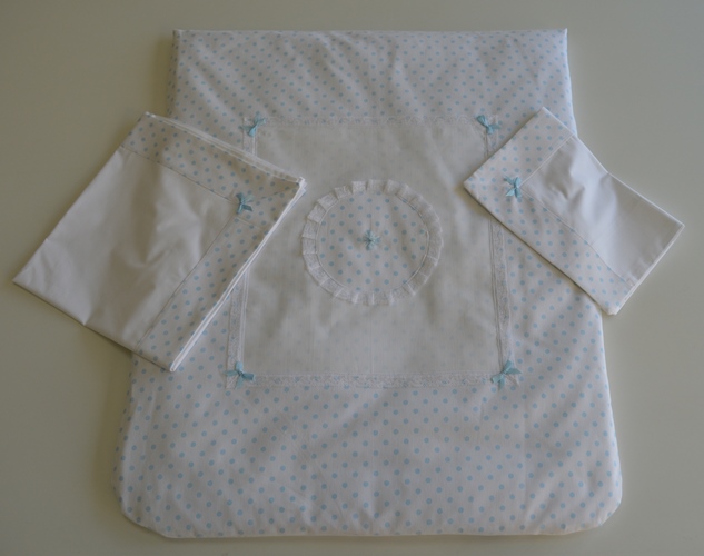 completo carrozzina artigianale comp. 100% cotone piquet colore fondo bianco con pua celeste rifinito con pizzo valance interno 100% poliestere trapuntina utilizzabile sia in inverno che in estate con il sistema sfoderabile lenzuola sopra misura cm 65x120 federa misura cm 38x29 trapuntina mis cm65x80 prodotto artigianale modificabile su richiesta del cliente