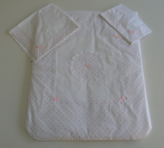 completo carrozzina artigianale comp. 100% cotone piquet colore fondo bianco con pua rosa rifinito con pizzo valance interno 100% poliestere trapuntina utilizzabile sia in inverno che in estate con il sistema sfoderabile lenzuola sopra misura cm 65x120 federa misura cm 38x29 trapuntina mis cm65x80 prodotto artigianale modificabile su richiesta del cliente