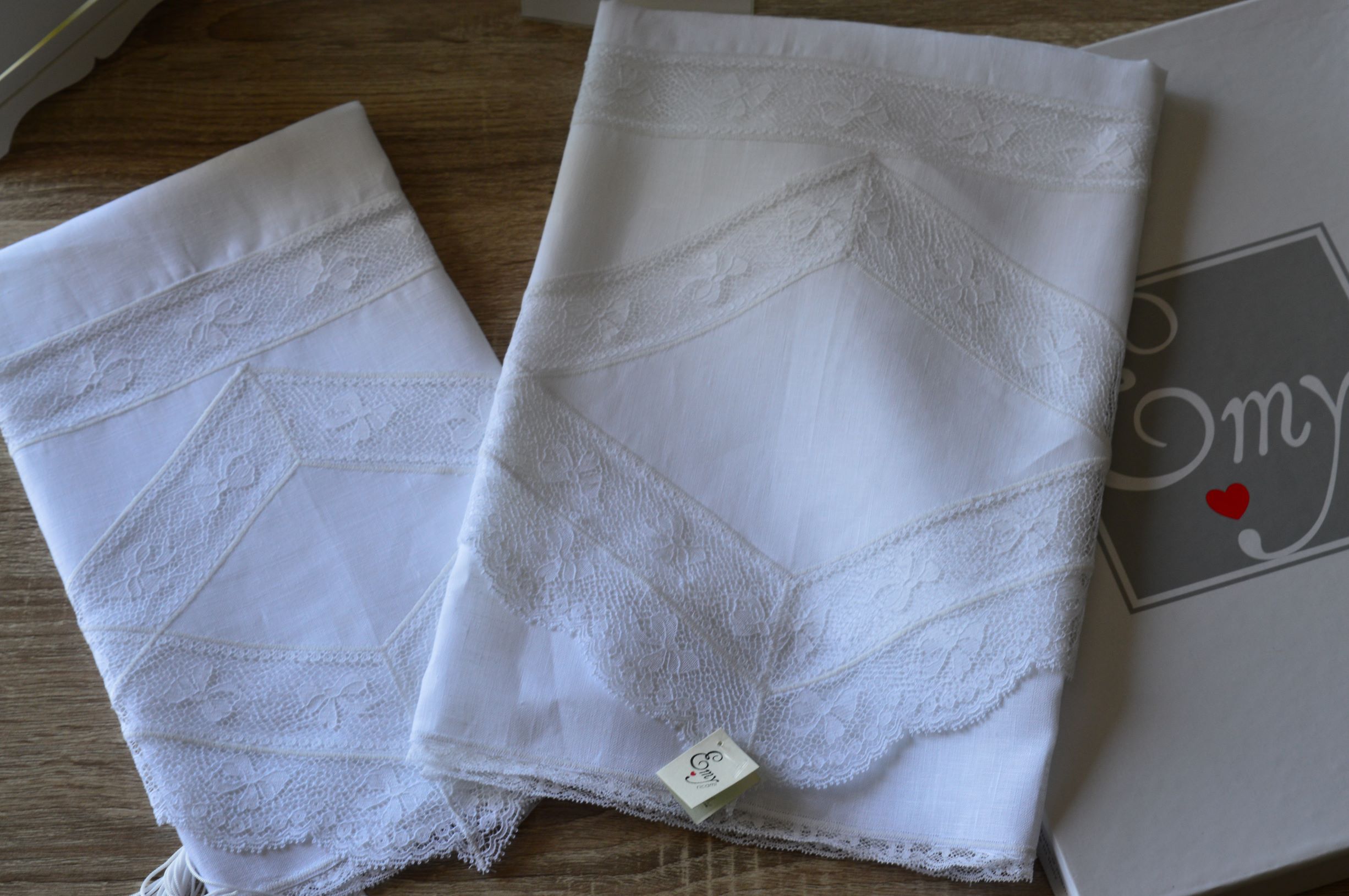 COPPIA 1+1 ASCIUGAMANI LAVORAZIONE ARTIGIANALE DI EMY RICAMI COMPOSIZIONE 100% PURO LINO ITALIANO RIFINITE CON PIZZO VALENCIENNE COLORE BIANCO MIS VISO CM 70X120 MIS OSPITE 73X50