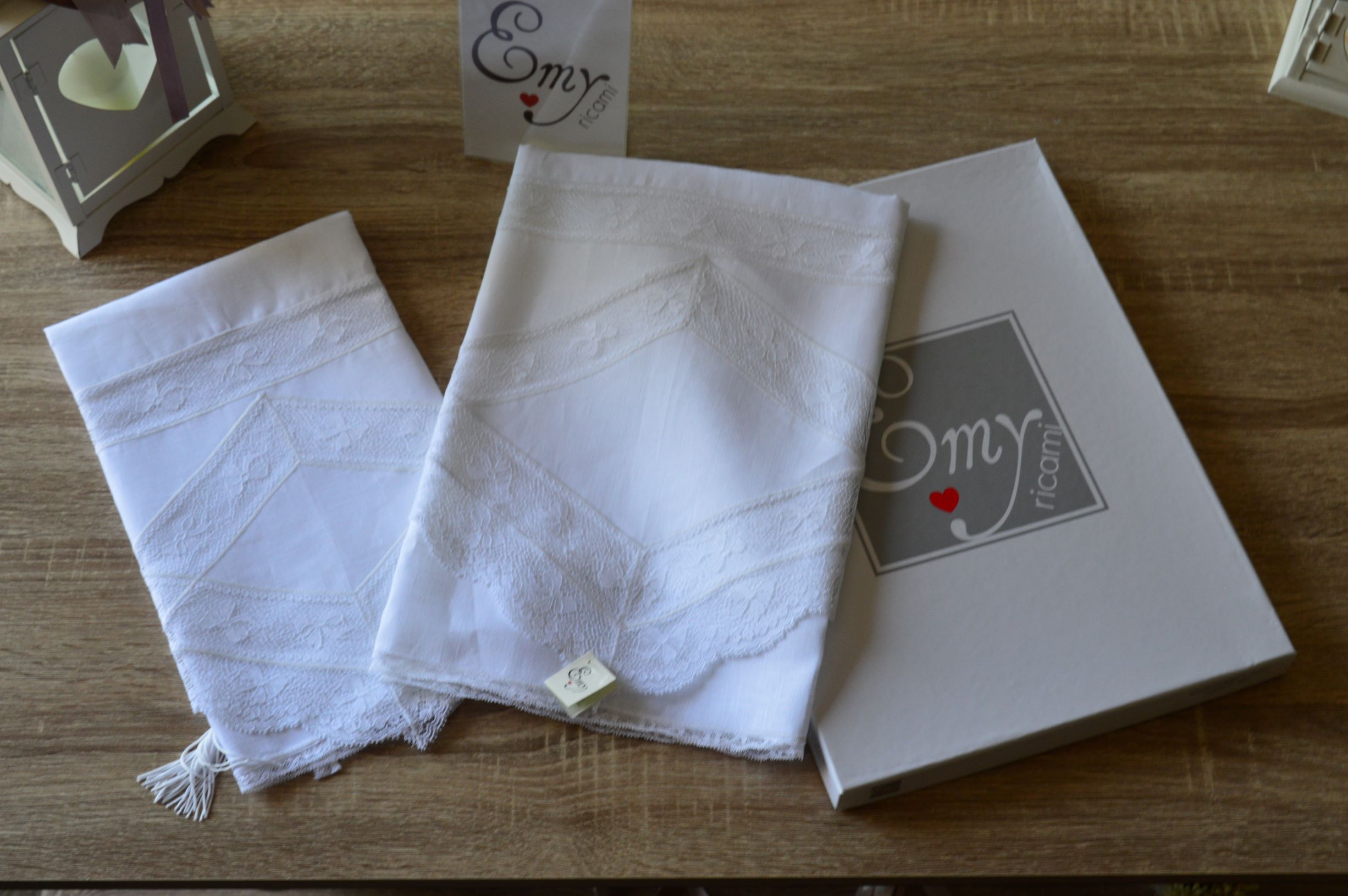 COPPIA 1+1 ASCIUGAMANI LAVORAZIONE ARTIGIANALE DI EMY RICAMI COMPOSIZIONE 100% PURO LINO ITALIANO RIFINITE CON PIZZO VALENCIENNE COLORE BIANCO MIS VISO CM 70X120 MIS OSPITE 73X50