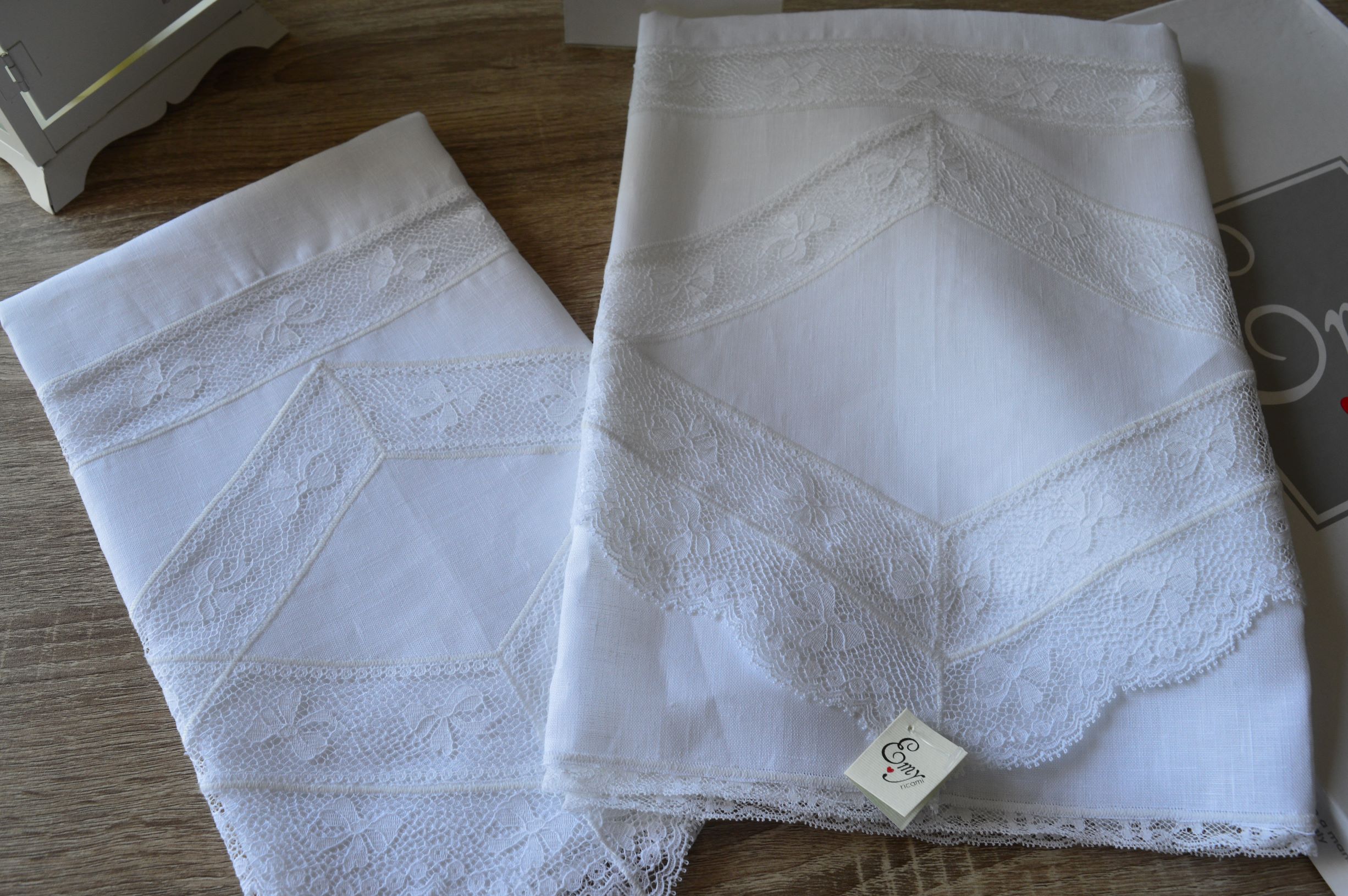 COPPIA 1+1 ASCIUGAMANI LAVORAZIONE ARTIGIANALE DI EMY RICAMI COMPOSIZIONE 100% PURO LINO ITALIANO RIFINITE CON PIZZO VALENCIENNE COLORE BIANCO MIS VISO CM 70X120 MIS OSPITE 73X50