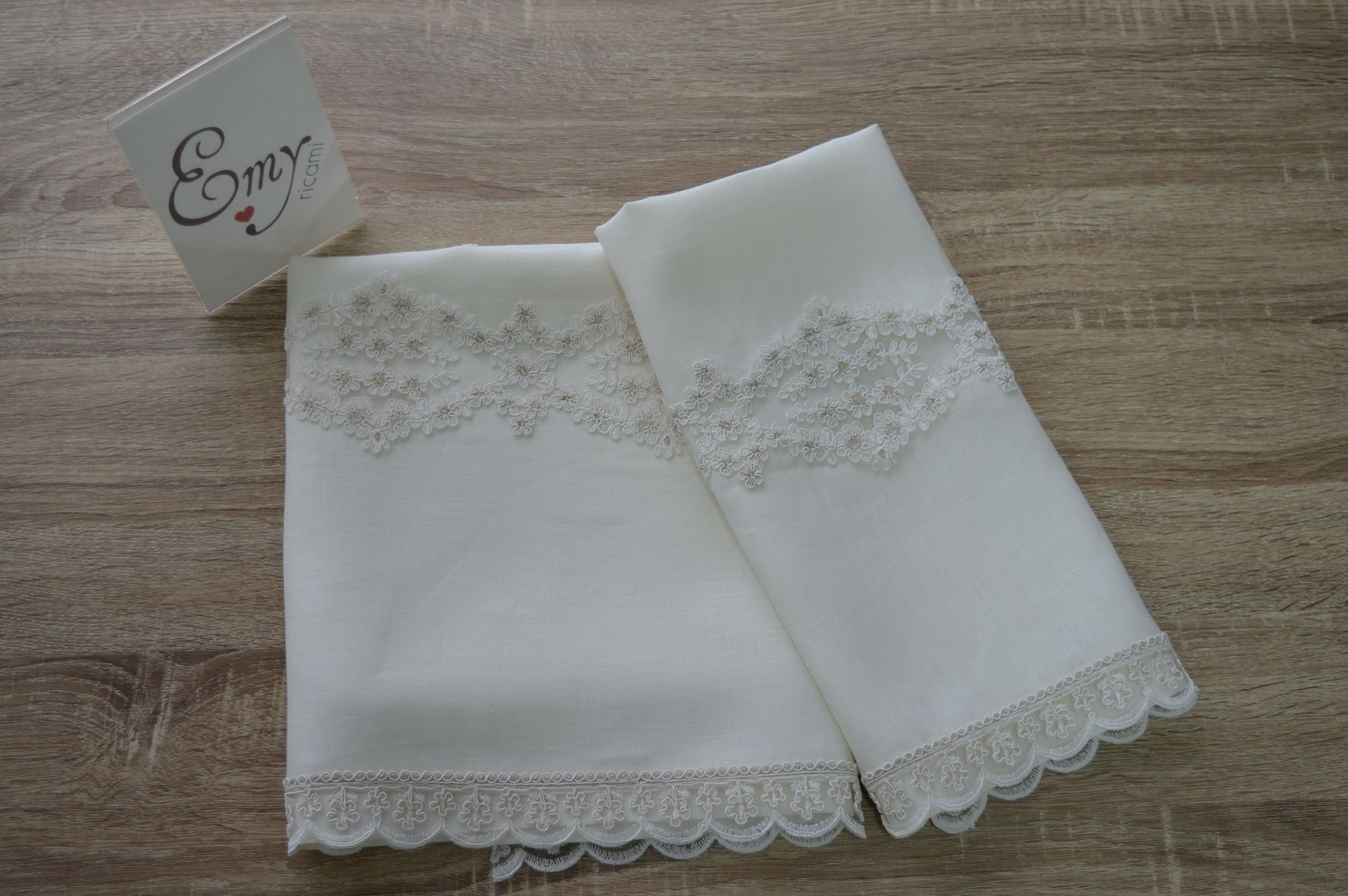 coppia asciugamani artigianale in lino e rebrode di Emy ricami colore avorio art Fara
