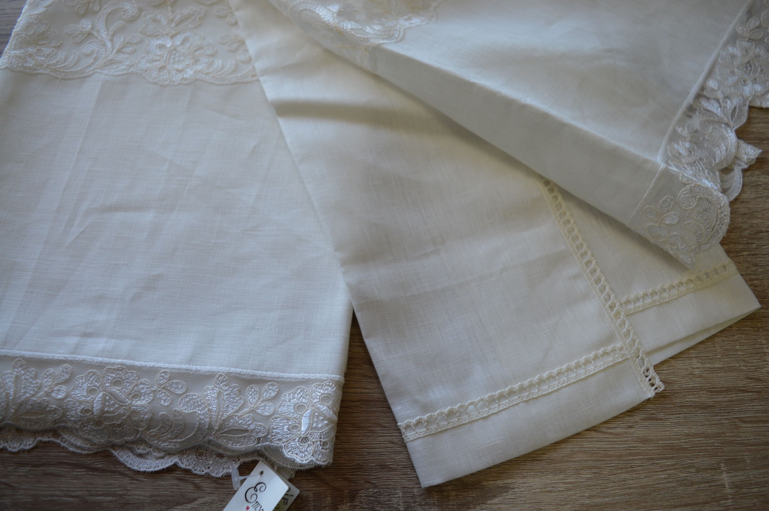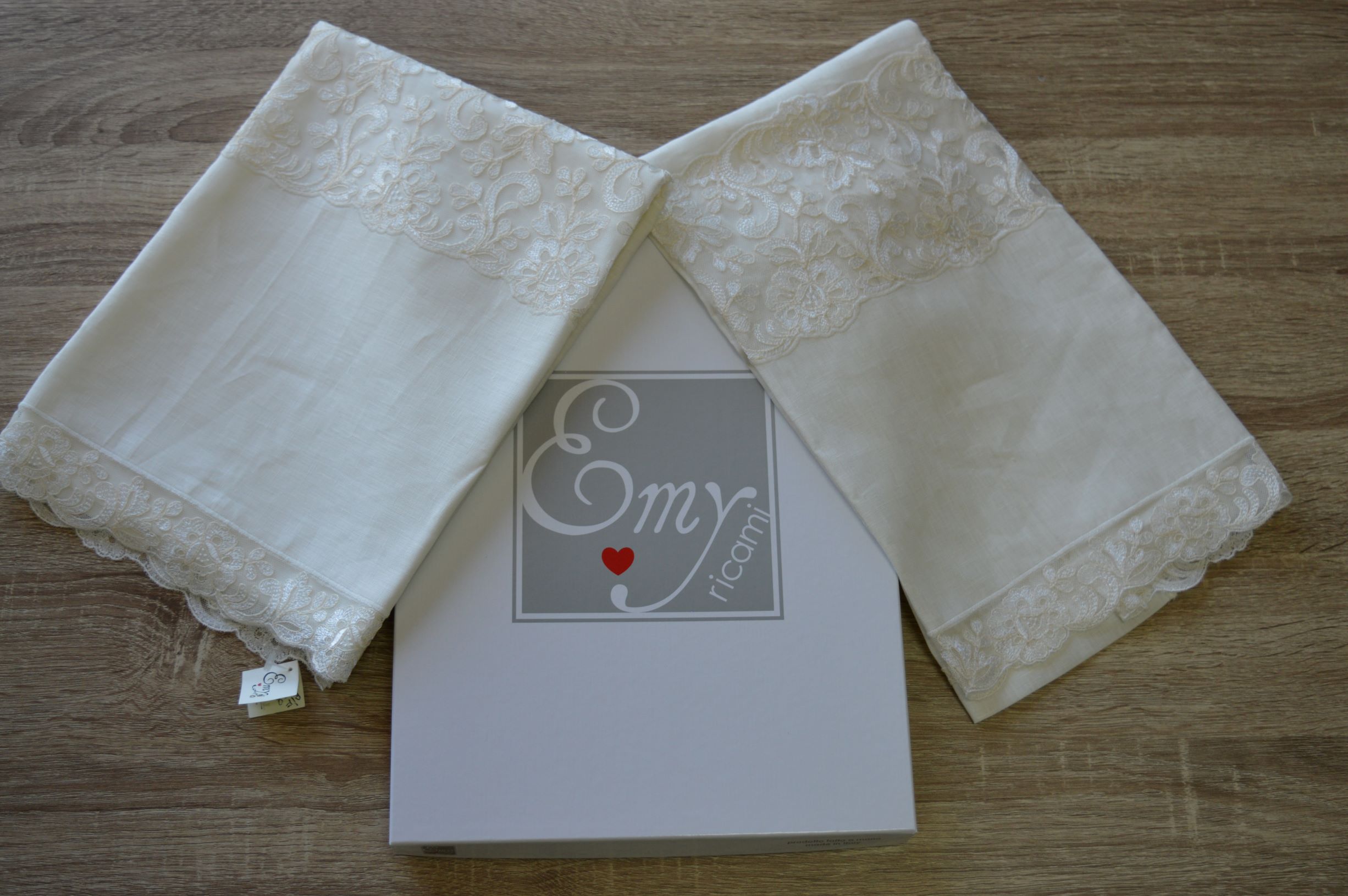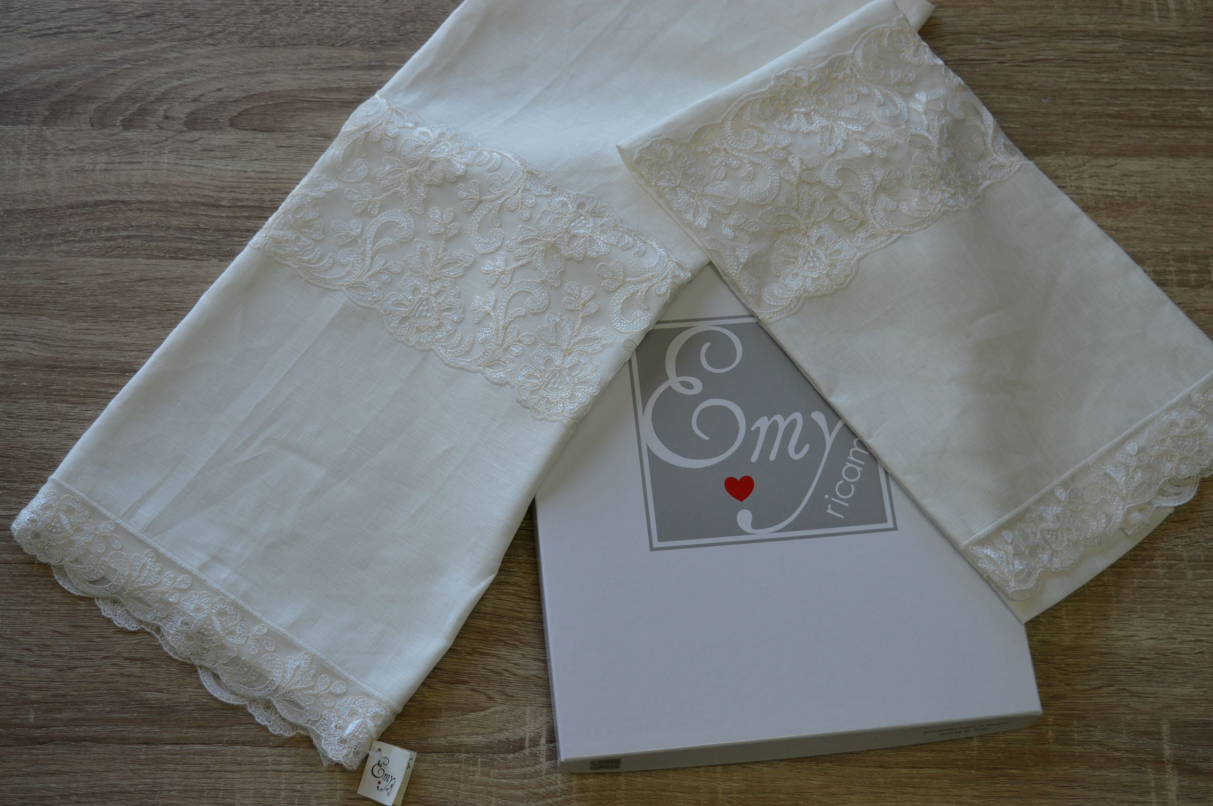 Coppia asciugamani in puro lino e tulle di Emy ricami col avorio art Tea