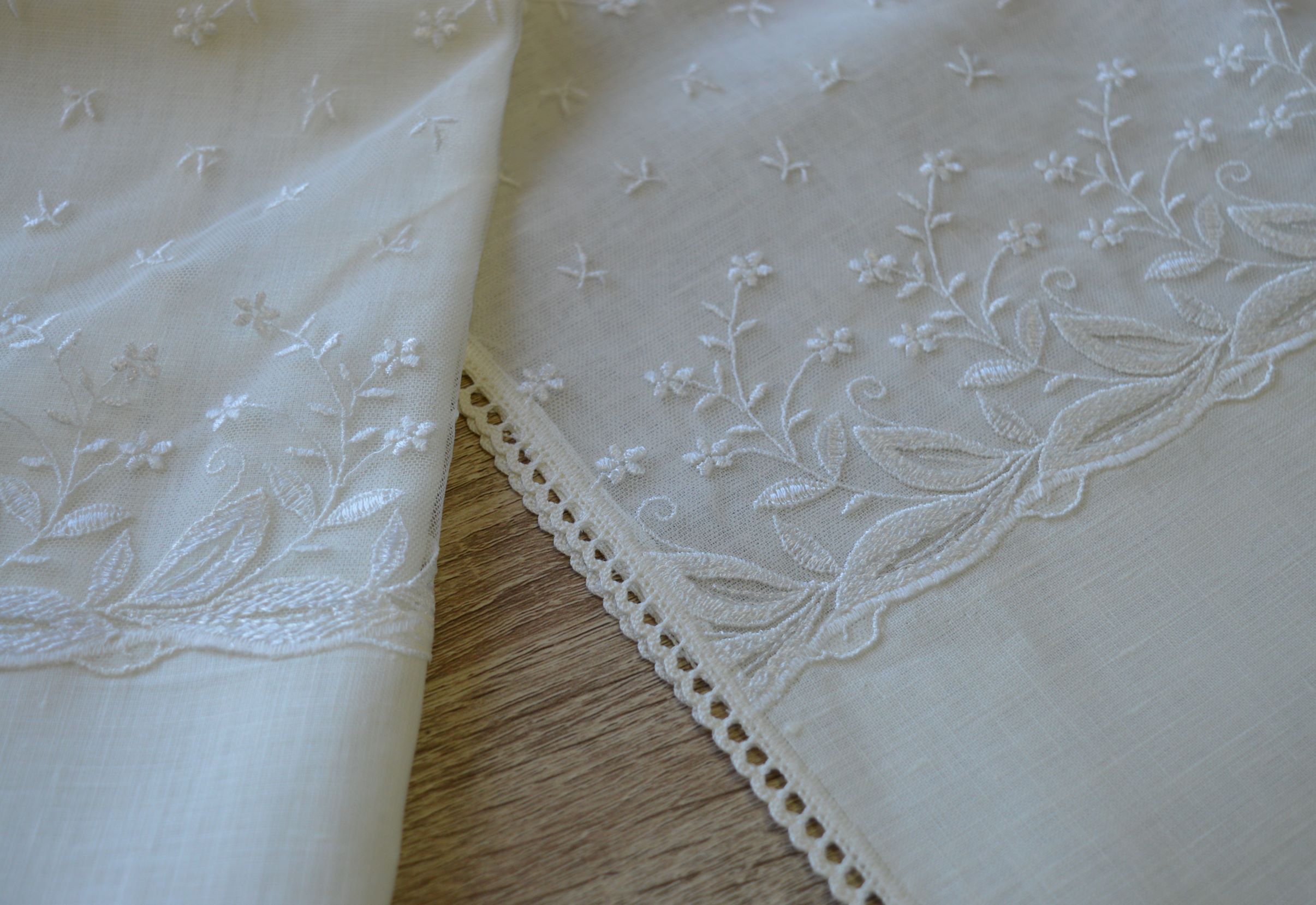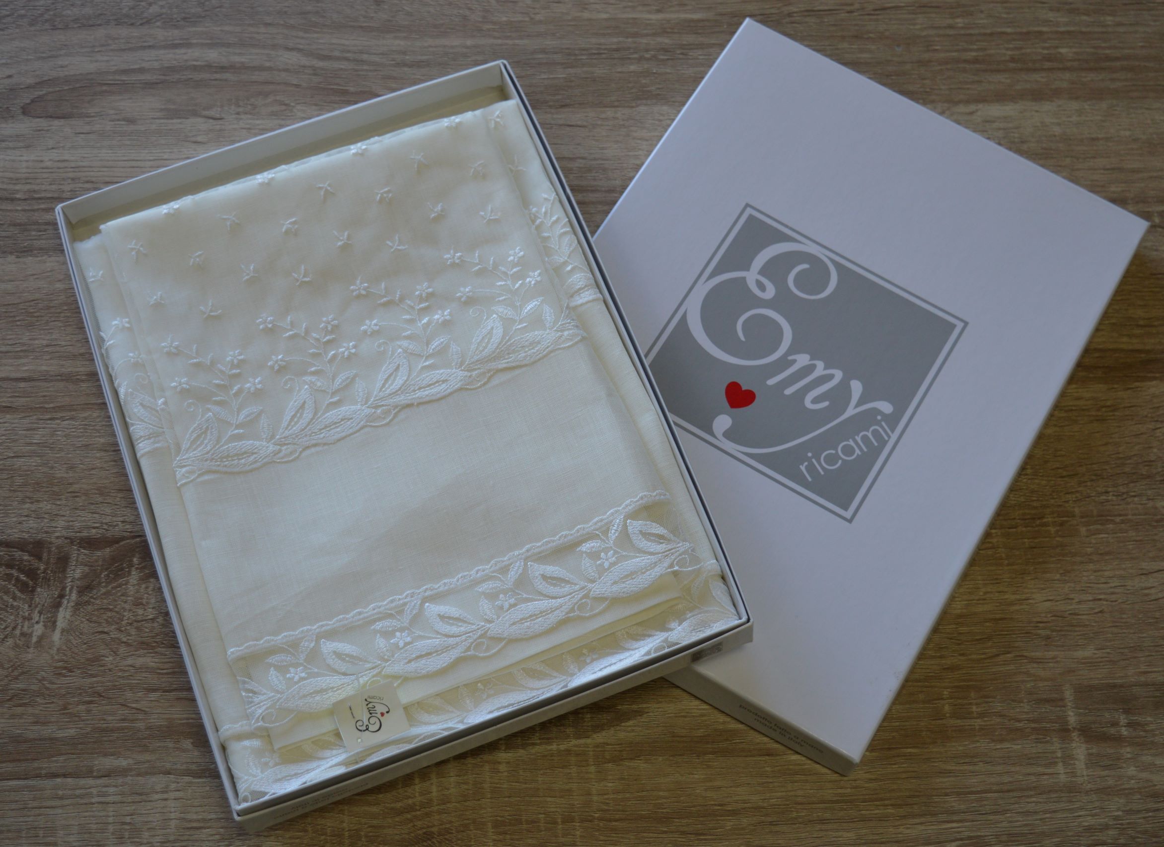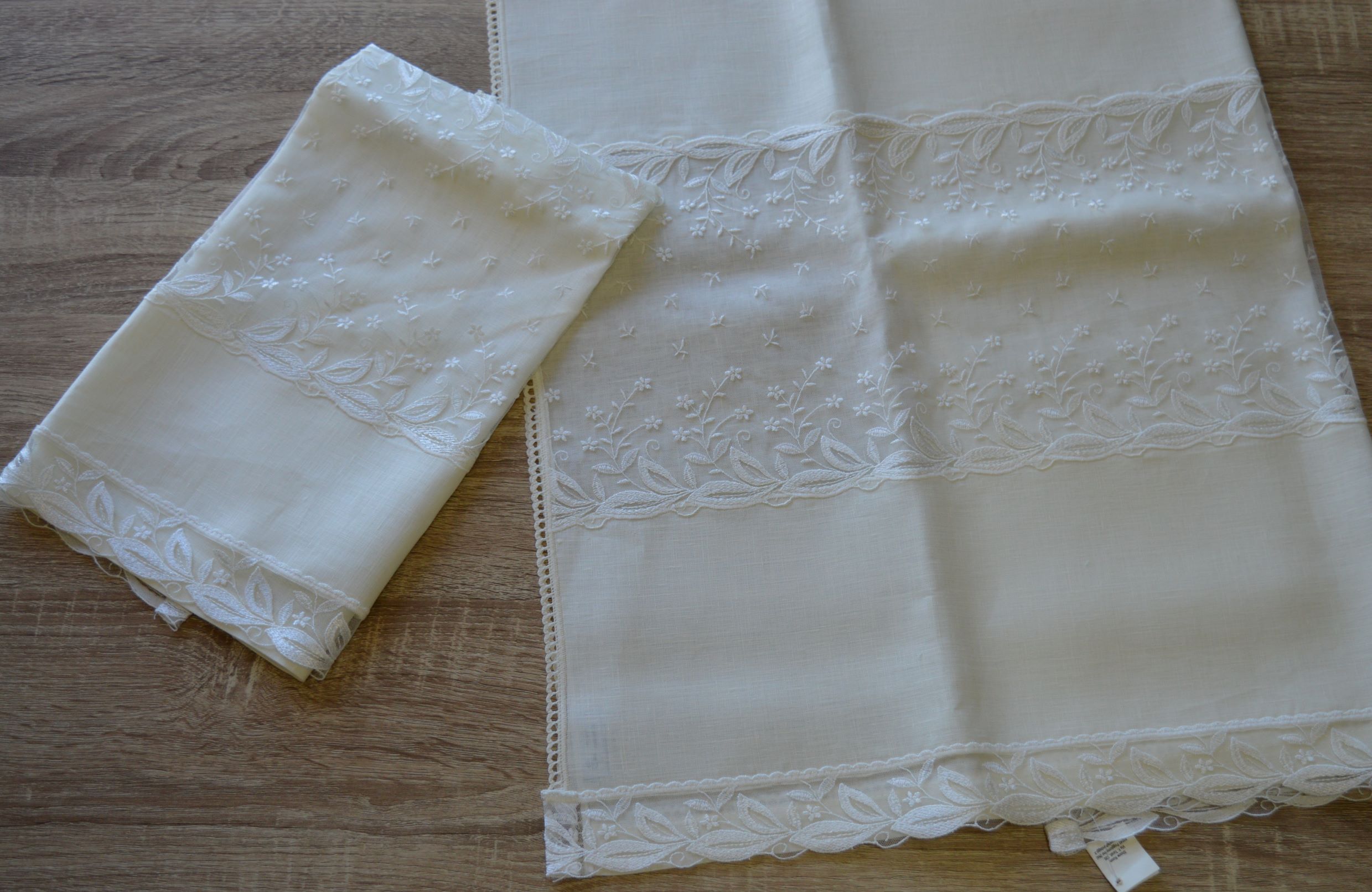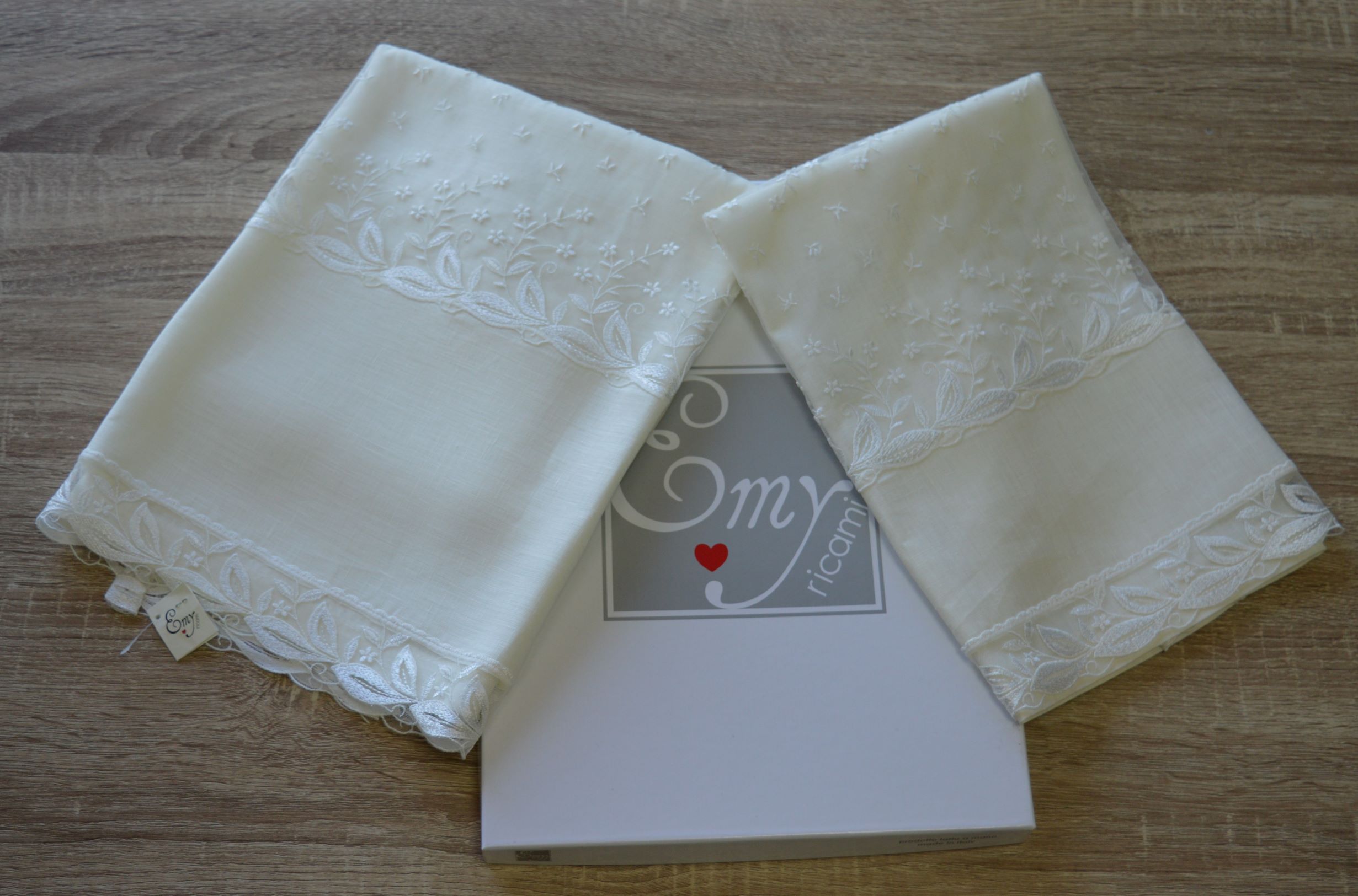 coppia asciugamani grande e piccola composizione 100% puro lino Italiano rifinita con un pregiatissimo pizzo in tulle ricamato mis piccola cm 50x70 grande cm 70x120 colore avorio creazioni artigianali di Emy ricami