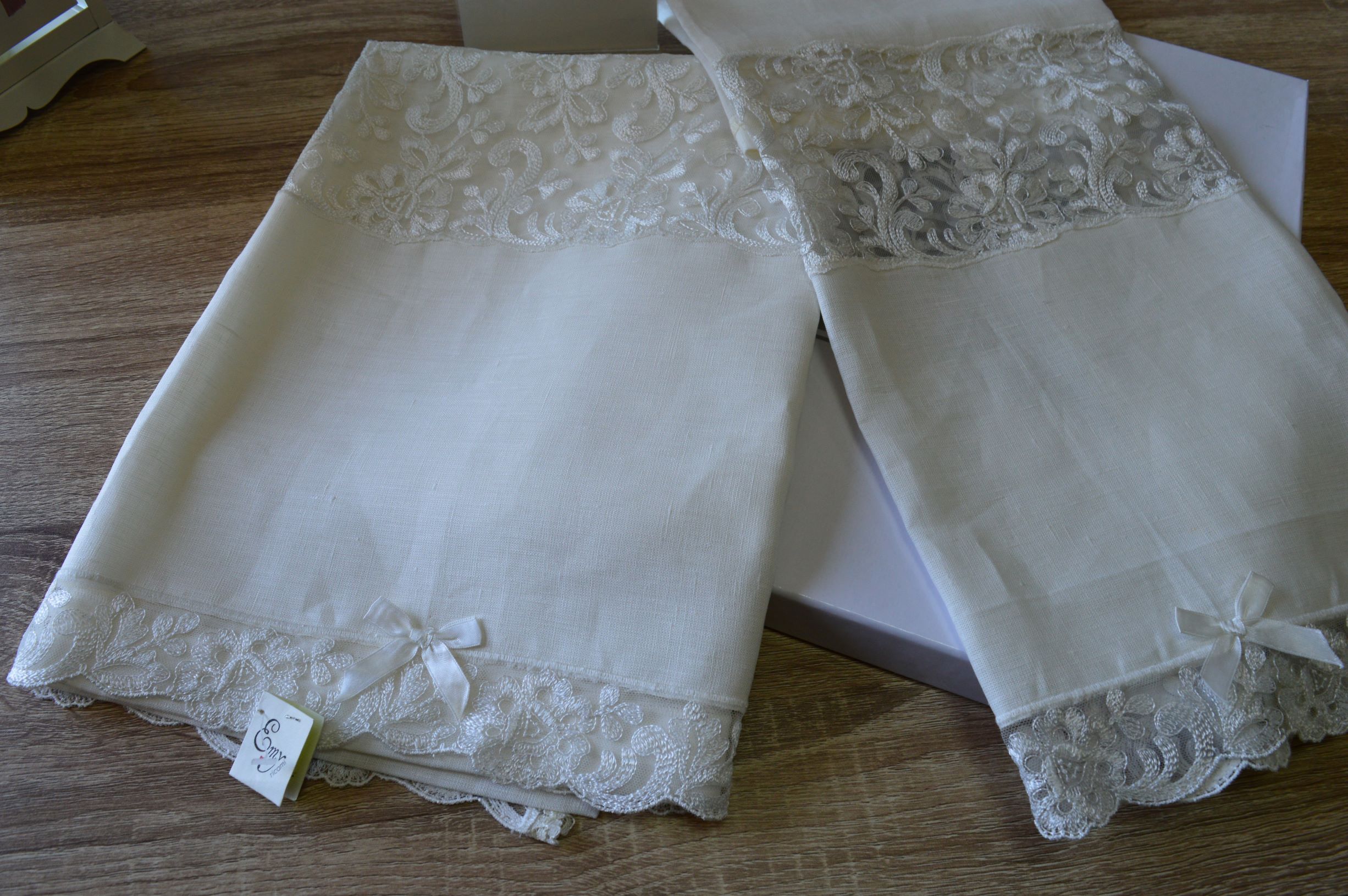 COPPIA ASCIUGAMANI LAVORAZIONE ARTIGIANALE COL AVORIO IN LINO E TULLE ART MARA