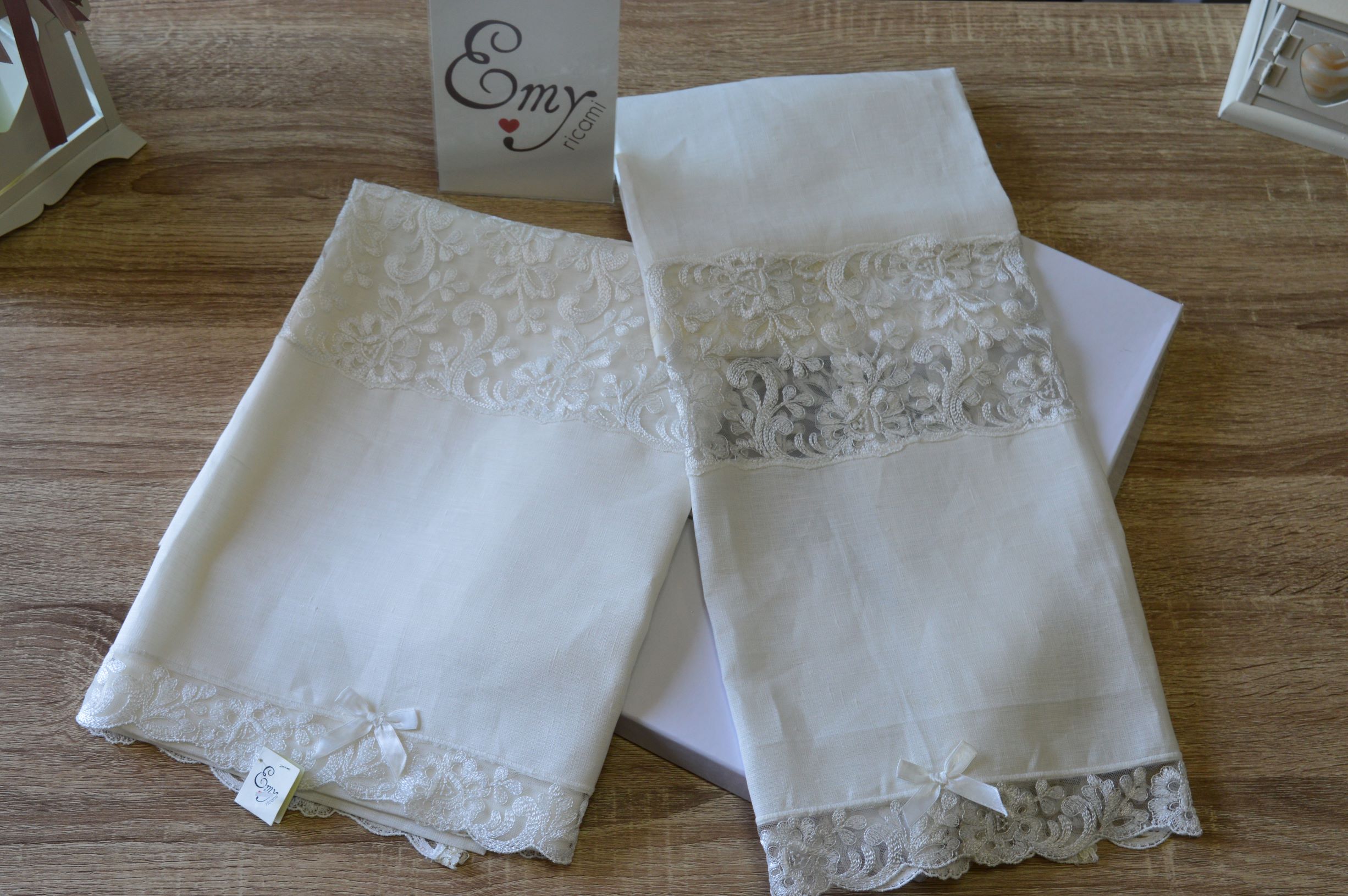 COPPIA ASCIUGAMANI LAVORAZIONE ARTIGIANALE COL AVORIO IN LINO E TULLE ART MARA