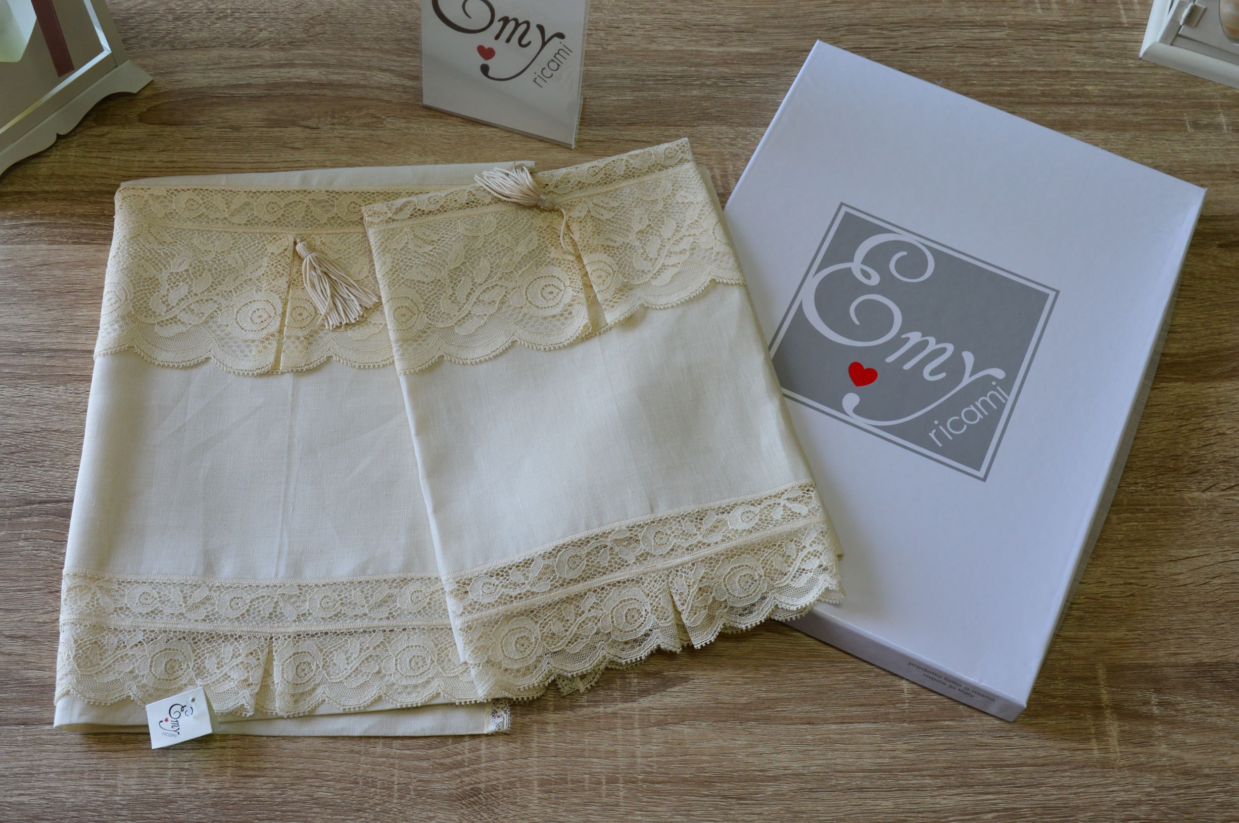 COPPIA 1+1 ASCIUGAMANI LAVORAZIONE ARTIGIANALE DI EMY RICAMI COMPOSIZIONE 100% PURO LINO ITALIANO RIFINITE CON PIZZO VALENCIENNE E CON ORLO A GIORNO FATTO A MANO COLORE BEIGE MIS VISO CM 70X120 MIS OSPITE 50X70