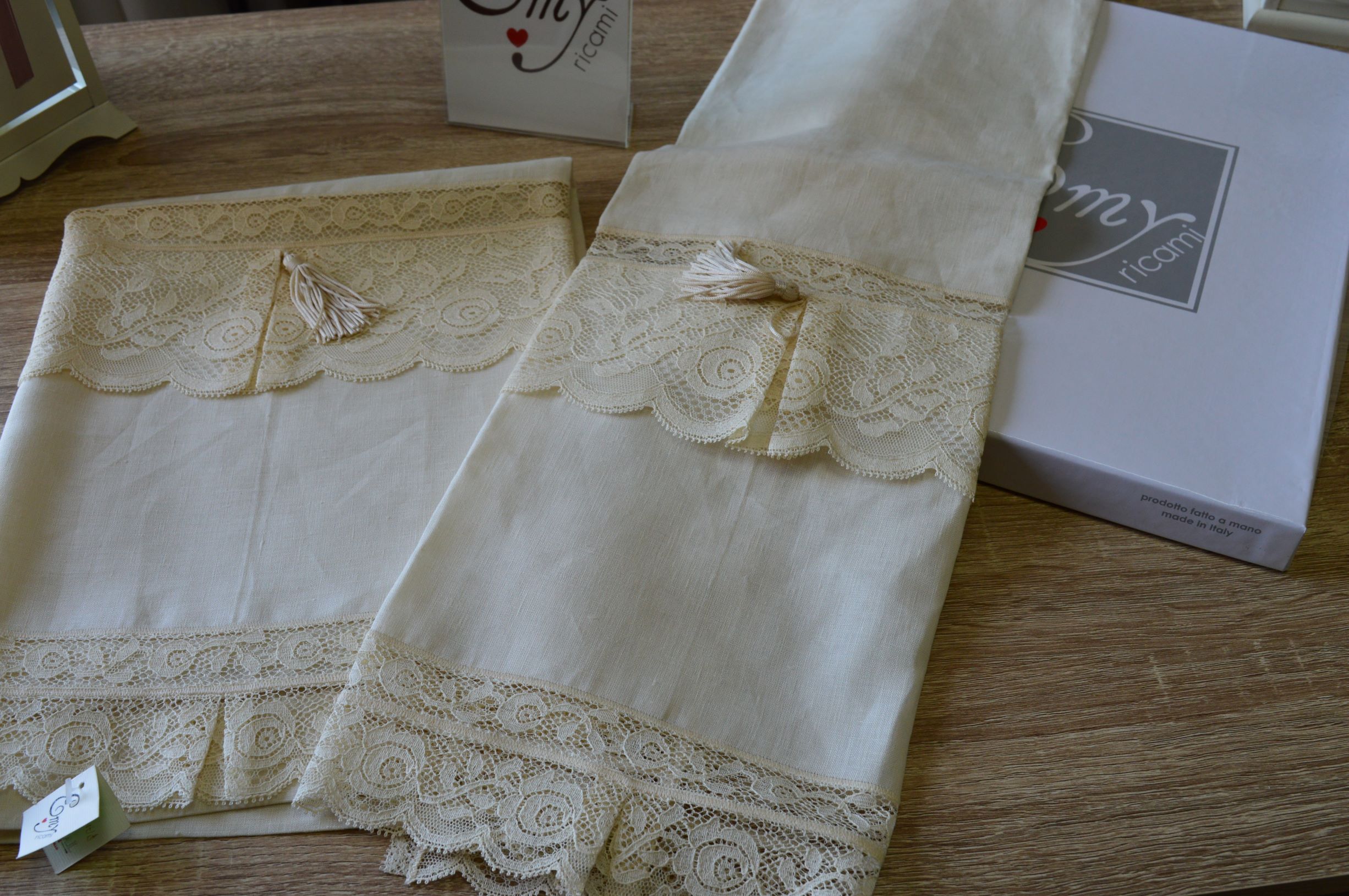 COPPIA 1+1 ASCIUGAMANI LAVORAZIONE ARTIGIANALE DI EMY RICAMI COMPOSIZIONE 100% PURO LINO ITALIANO RIFINITE CON PIZZO VALENCIENNE E CON ORLO A GIORNO FATTO A MANO COLORE BEIGE MIS VISO CM 70X120 MIS OSPITE 50X70