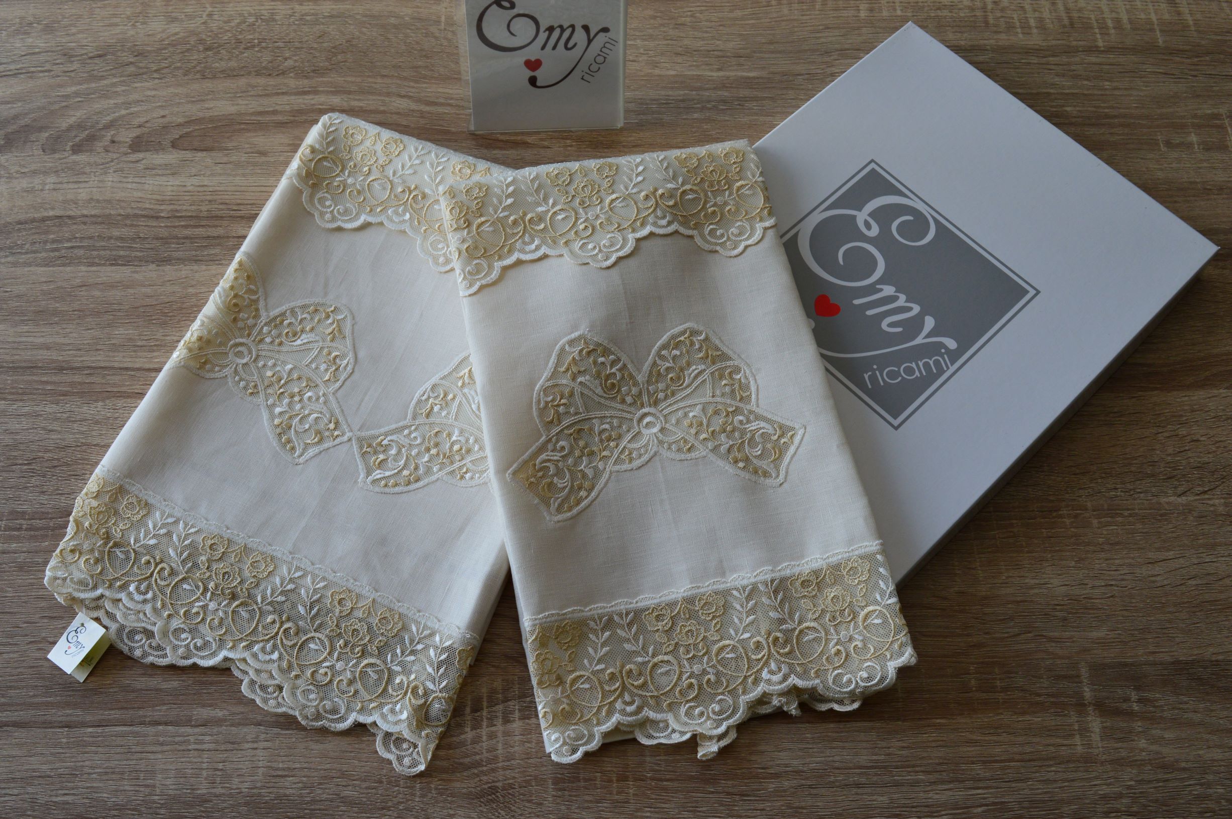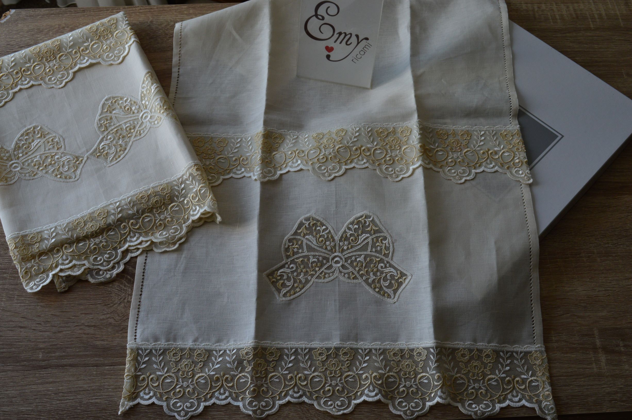 COPPIA ASCIUGAMANI ARTIGIANALE DI EMY RICAMI IN LINO E TULLE ART LARISSA