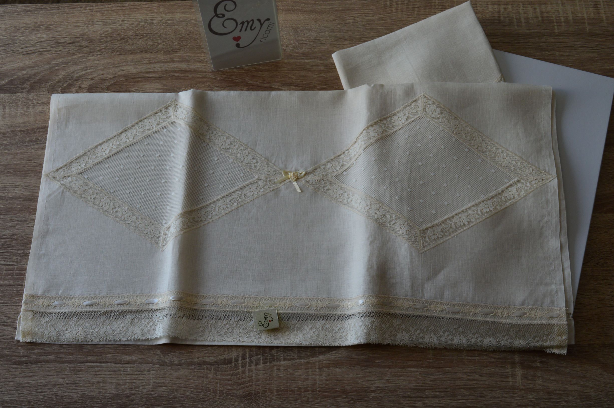 COPPIA 1+1 ASCIUGAMANI LAVORAZIONE ARTIGIANALE COMPOSIZIONE 100% PURO LINO ITALIANO RIFINITE CON PIZZO VALENCIENNE E CON ORLO A GIORNO FATTO A MANO COLORE AVORIO MIS VISO CM 70X128 MIS OSPITE 45X68