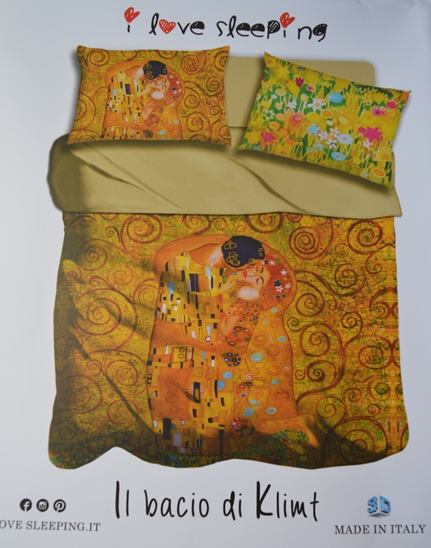 COPPIA LENZUOLA COPRILETTO MATRIMONIALE STAMPA DIGITALE IN TRE D IL BACIO DI KLIMT COMPOSIZIONE 100% COTONE PERCALLE DEI MAESTRI COTONIERI IL LENZUOLO ESCE COME DA FOTO MISURE LENZUOLO SOPRA FANTASIA 265X300 LENZUOLA SOTTO CON ANGOLI TINTA UNITA 175X200 2 FEDERE FANTASIA TRE D 52X82 IL LENZUOLO SOPRA FUNGE ANCHE DA LENZUOLO COPRILETTO CON LA STAMPA IN TRE D, E LO RENDONO UN CAPO UNICO NEL SUO GENERE MADE IN ITALY