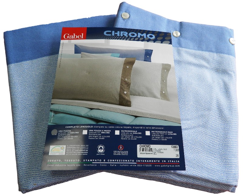 COMPLETO LENZUOLO SINGOLO GABEL CHROMO COLORE BLU MISURA SINGOLA LENZUOLA SOPRA 160X285 LENZUOLA SOTTO CON ANGOLI MISURA 90X200 FEDERA 50X80 COMPOSIZIONE 100% PURO COTONE CALDO FELPATO GABEL GARANTISCE CHE IL PRODOTTO E TUTTO MADE IN ITALY