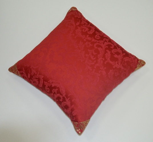 CUSCINO DECORATIVO COLORE ROSSO CON ANGOLI DORATI MISURA: 40X40 CM COMPOSIZIONE: 65% POLIESTERE - 35% COTONE IMBOTTITURA: 100% POLIESTERE ANALLERGICO CUSCINO SFODERABILE.