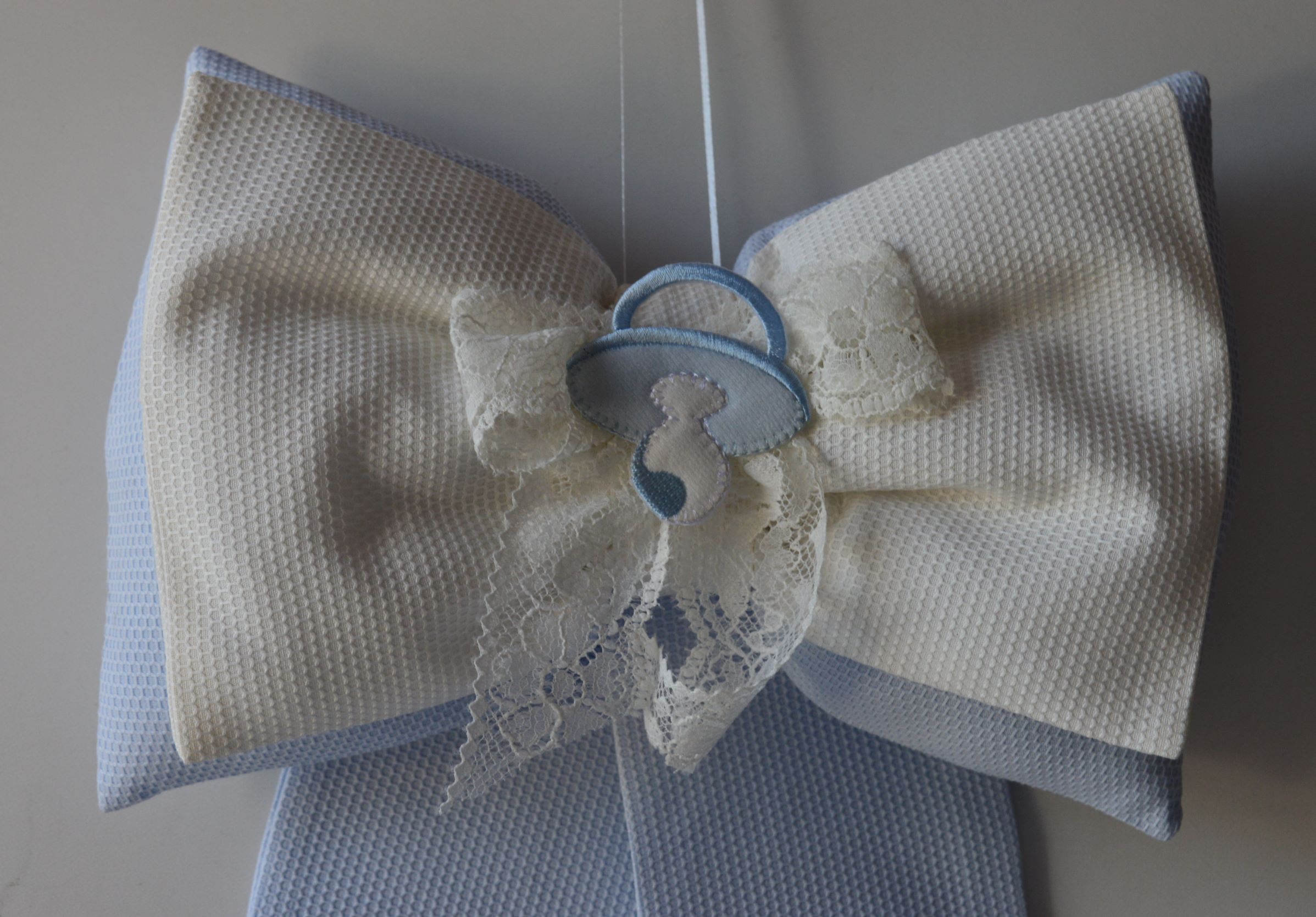 Doppio fiocco nascita comp 100% cotone piquet colore celeste e avorio rifinito con applicazione e pizzo valenciennes misura cm 25x40 creazione artigianale di Emy ricami su richiesta è possibile personalizzare il tutto contattando i nostri info