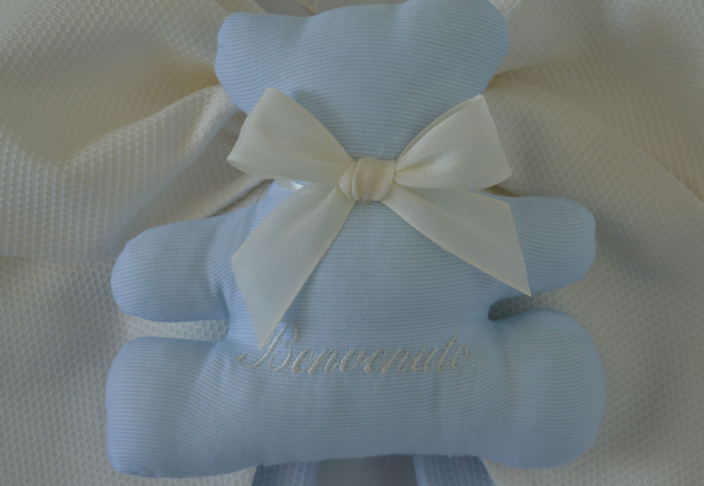 DOPPIO FIOCCO NASCITA ARTIGIANALE DI EMY RICAMI IN COTONE PIQUET COL CELESTE ART BENVENUTO