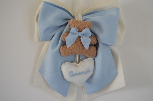 Doppio fiocco nascita comp 100% puro lino italiano colore avorio e celeste con pupazzo e cuoricino ricamato benvenuto misura cm 40x50 creazione artigianale di Emy ricami su richiesta è possibile personalizzare il tutto contattando i nostri info