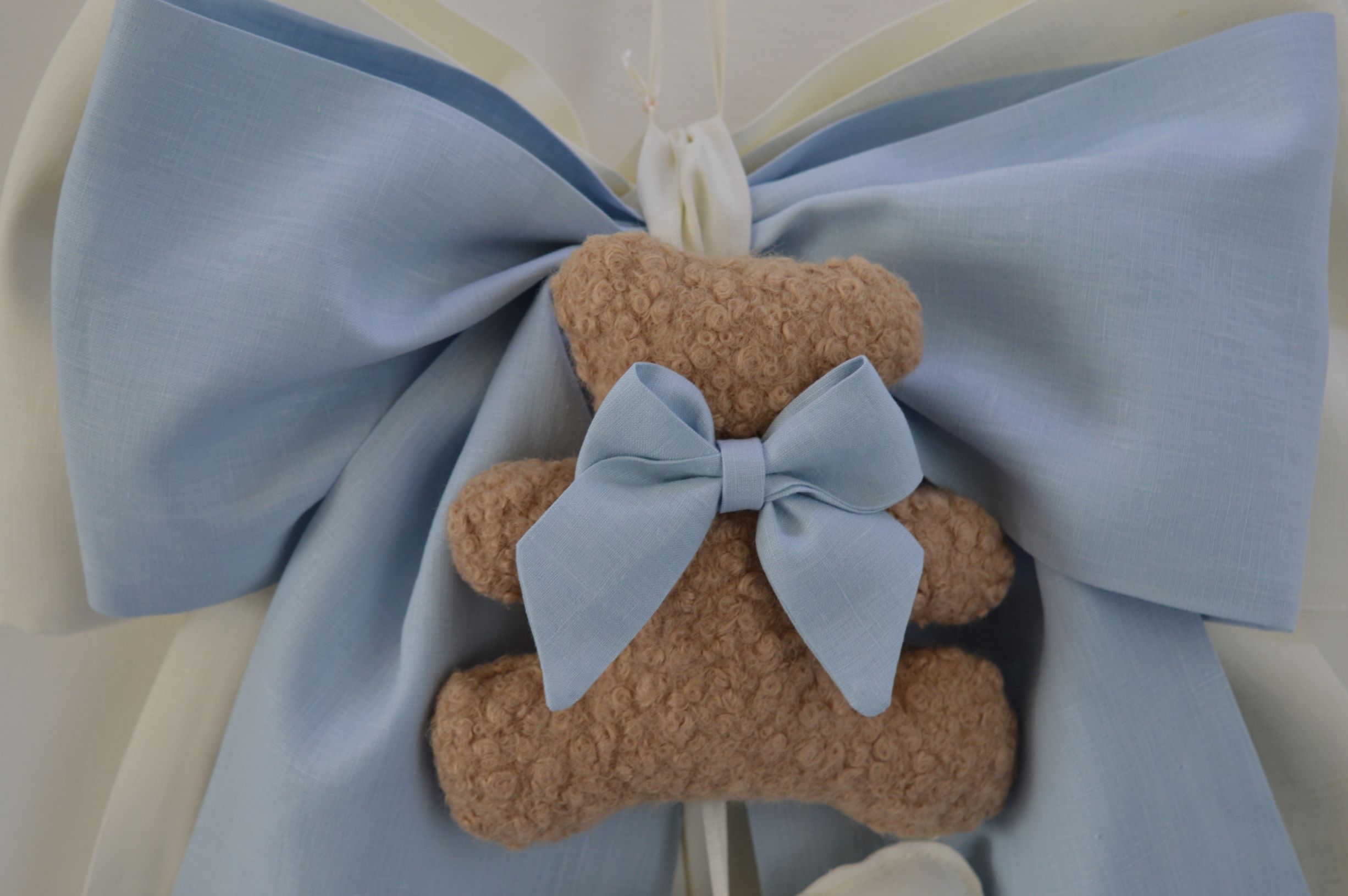 Doppio fiocco nascita comp 100% puro lino italiano colore avorio e celeste con pupazzo e cuoricino ricamato benvenuto misura cm 40x50 creazione artigianale di Emy ricami su richiesta è possibile personalizzare il tutto contattando i nostri info