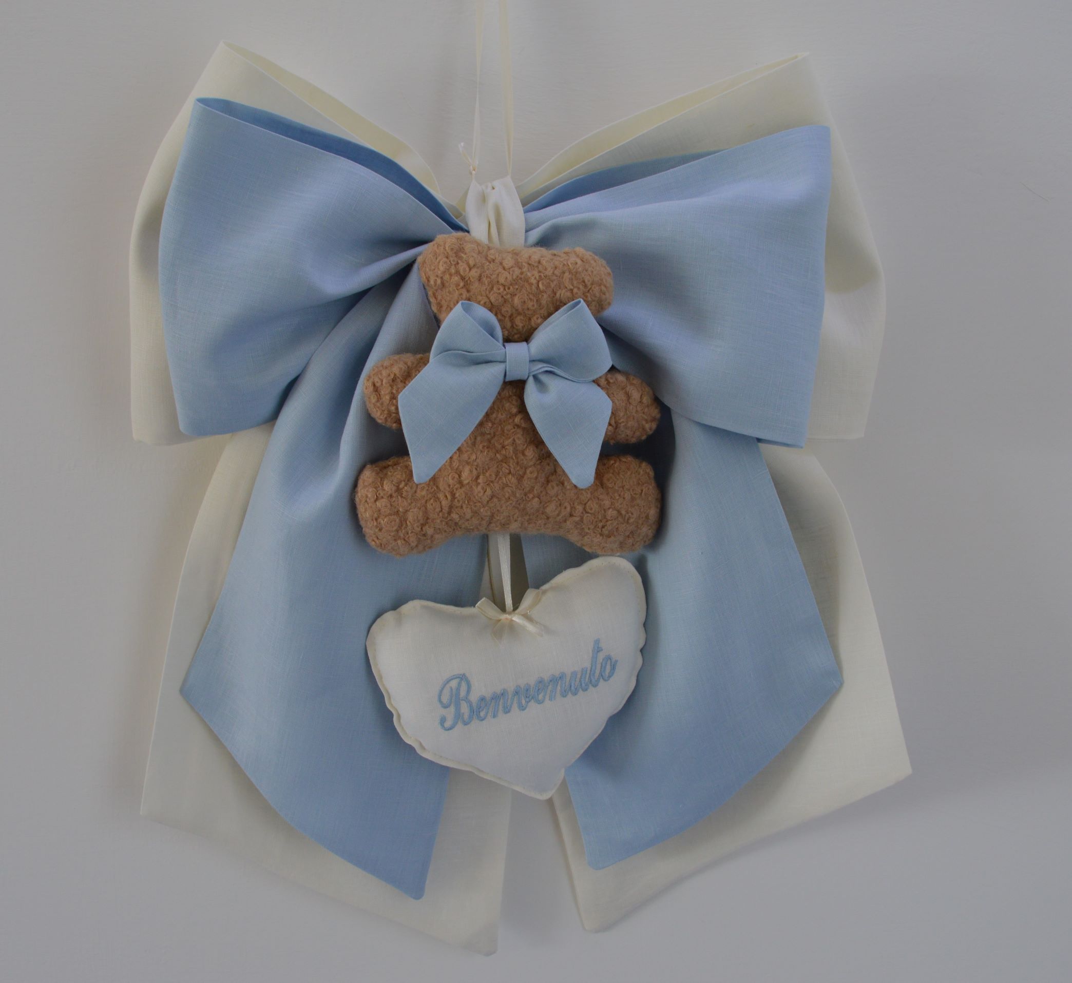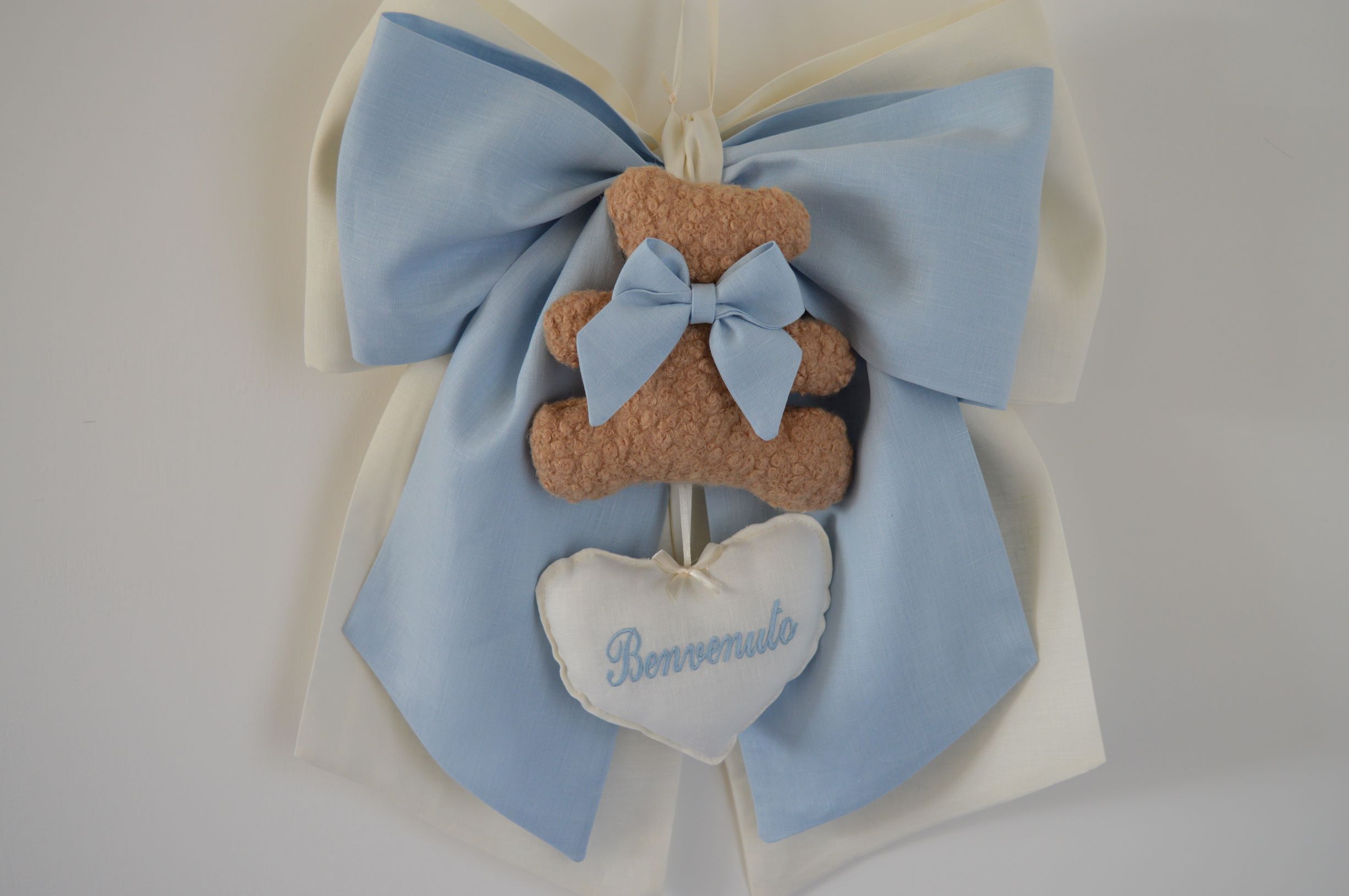 Doppio fiocco nascita comp 100% puro lino italiano colore avorio e celeste con pupazzo e cuoricino ricamato benvenuto misura cm 40x50 creazione artigianale di Emy ricami su richiesta è possibile personalizzare il tutto contattando i nostri info