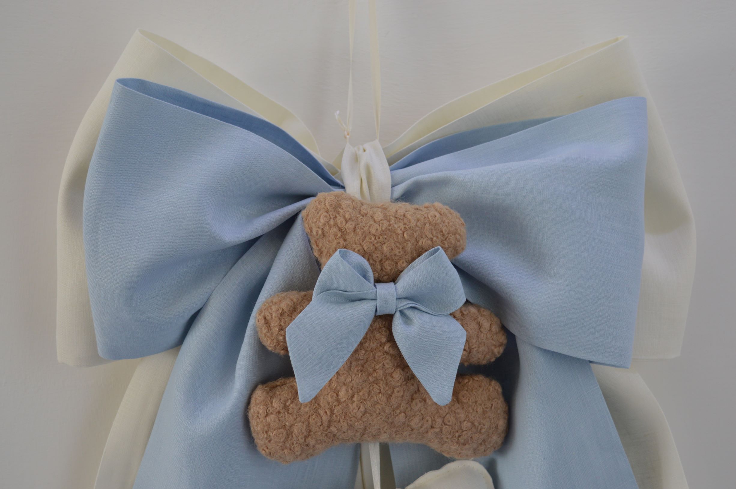 Doppio fiocco nascita comp 100% puro lino italiano colore avorio e celeste con pupazzo e cuoricino ricamato benvenuto misura cm 40x50 creazione artigianale di Emy ricami su richiesta è possibile personalizzare il tutto contattando i nostri info