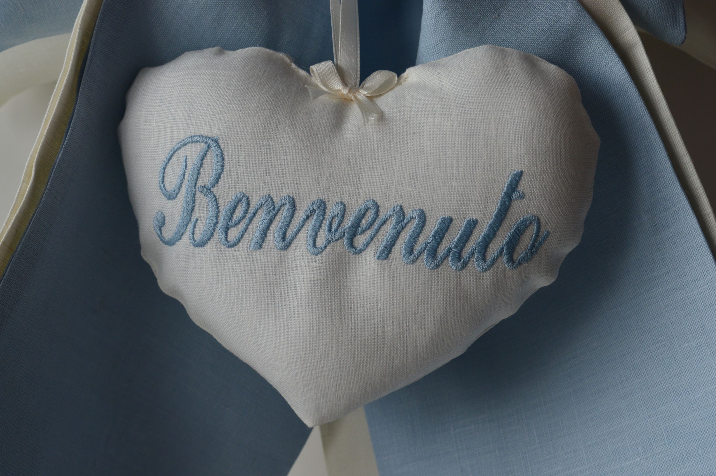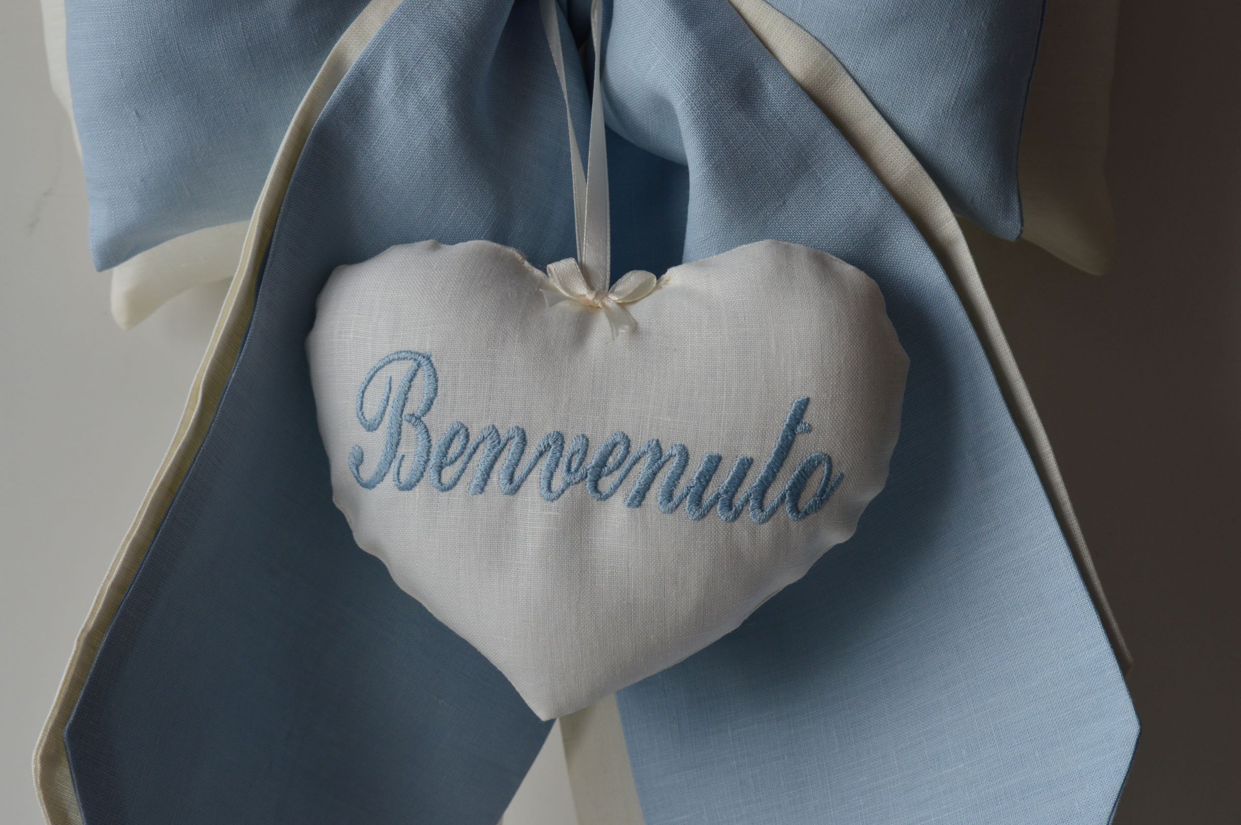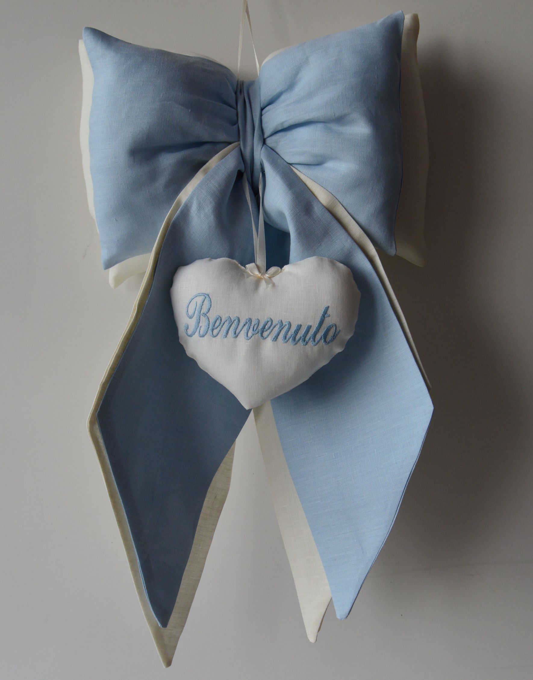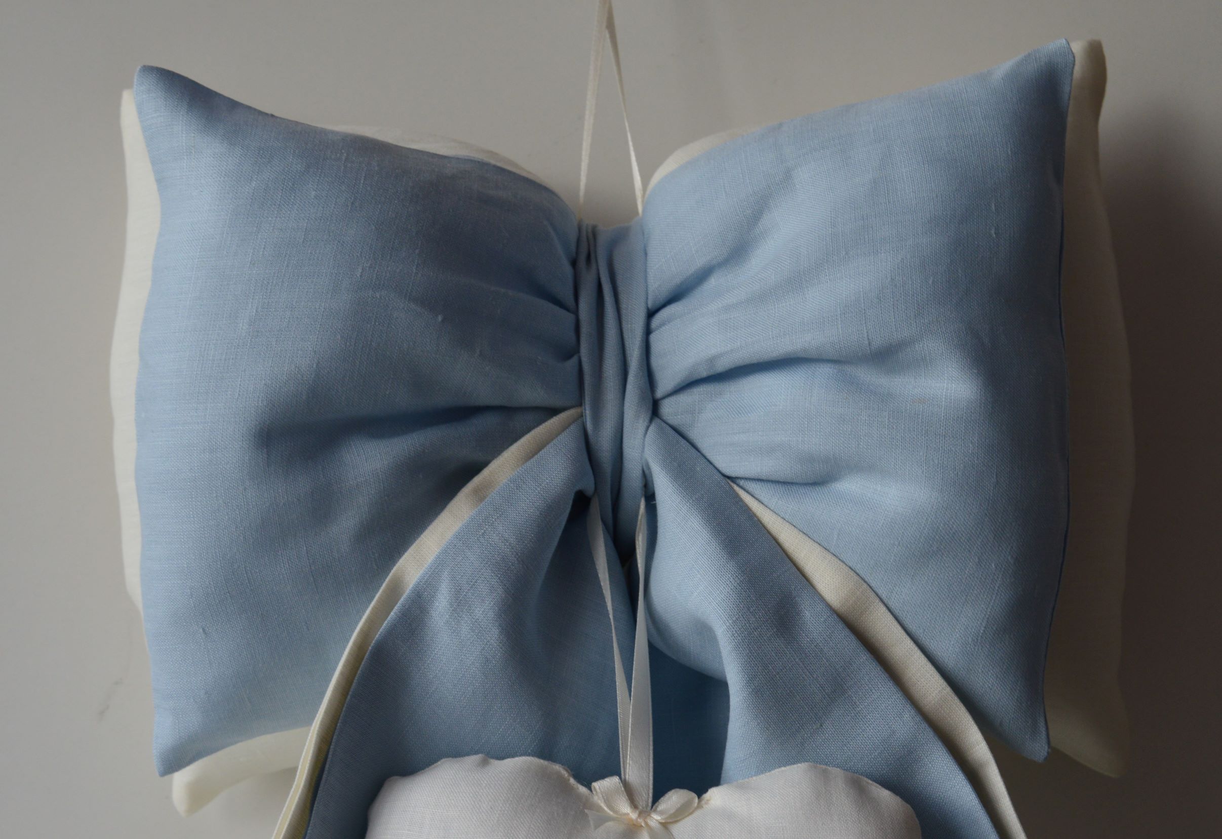 DOPPIO FIOCCO IMBOTTITO ARTIGIANALE DI EMY RICAMI COMPOSIZIONE 100% PURO LINO ITALIANO COLORE AVORIO E CELESTE MISURE ALTO CM 50X 30 LARGO SPESSORE 12 SU RICHIESTA è POSSIBILE PERSONALIZZARE IL PRODOTTO CONTATTANDO I NOSTRI INFO.