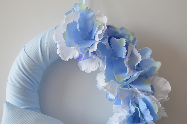 fiocco nascita mod.simone colore celeste misure largo cm 25 x 50 alto e 12 di spessore composizione 100% cotone piquet impreziosito con rose ed ortensie