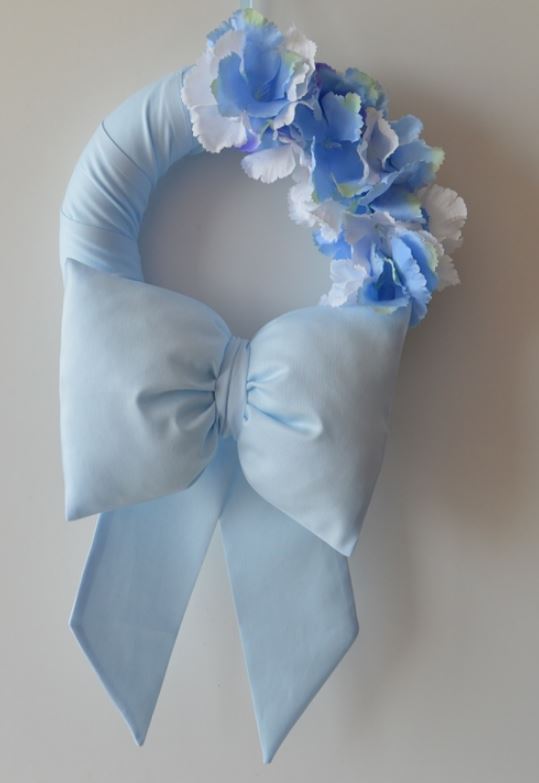 fiocco nascita mod.simone colore celeste misure largo cm 25 x 50 alto e 12 di spessore composizione 100% cotone piquet impreziosito con rose ed ortensie