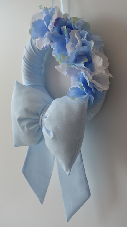 fiocco nascita mod.simone colore celeste misure largo cm 25 x 50 alto e 12 di spessore composizione 100% cotone piquet impreziosito con rose ed ortensie