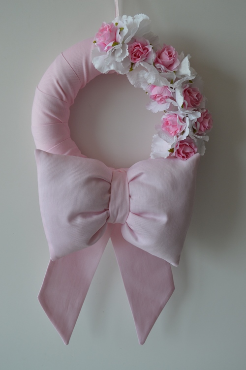 fiocco nascita mod.anastasia misure largo cm 25 x 50 alto e 12 di spessore composizione 100% cotone piquet impreziosito con rose ed ortensie